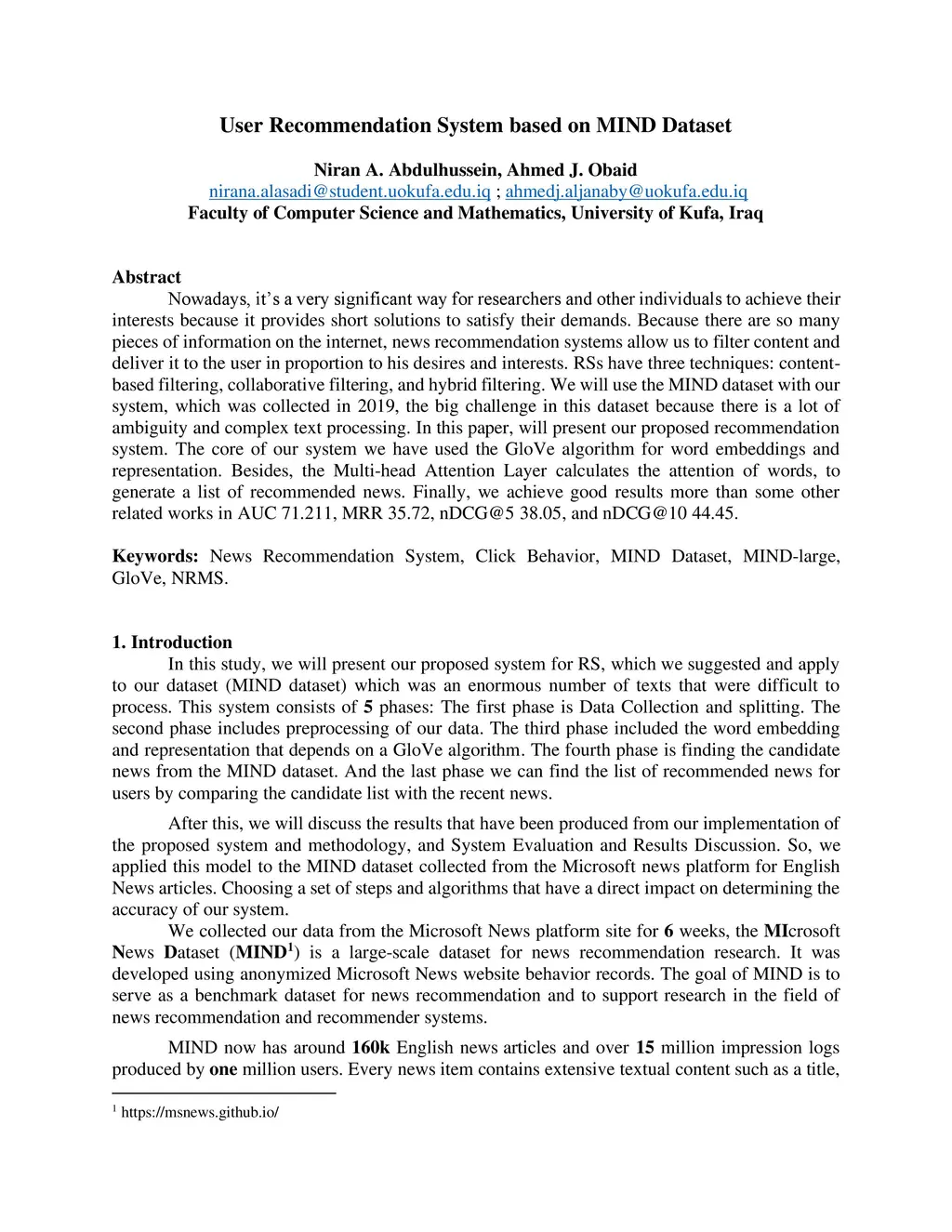 Nowadays, it's a very significant way for researchers and other individuals to achieve their interests because it provides short solutions to satisfy their demands. Because there are so many pieces of information on the internet, news recommendation systems allow us to filter content and deliver it to the user in proportion to his desires and interests. RSs have three techniques: content-based filtering, collaborative filtering, and hybrid filtering. We will use the MIND dataset with our system, which was collected in 2019, the big challenge in this dataset because there is a lot of ambiguity and complex text processing. In this paper, will present our proposed recommendation system. The core of our system we have used the GloVe algorithm for word embeddings and representation. Besides, the Multi-head Attention Layer calculates the attention of words, to generate a list of recommended news. Finally, we achieve good results more than some other related works in AUC 71.211, MRR 35.72, nDCG@5 38.05, and nDCG@10 44.45.