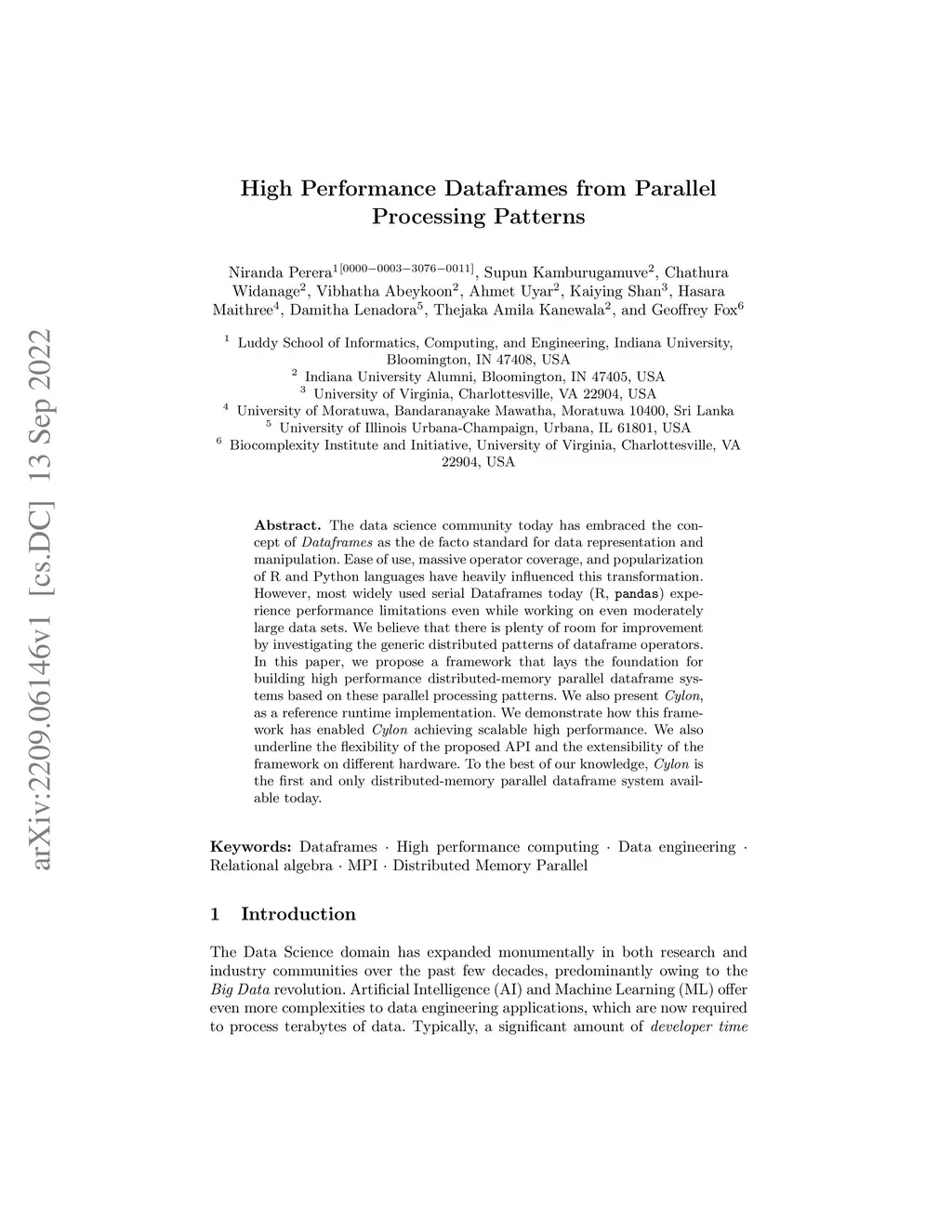 The data science community today has embraced the concept of Dataframes as the de facto standard for data representation and manipulation. Ease of use, massive operator coverage, and popularization of R and Python languages have heavily influenced this transformation. However, most widely used serial Dataframes today (R, pandas) experience performance limitations even while working on even moderately large data sets. We believe that there is plenty of room for improvement by investigating the generic distributed patterns of dataframe operators. In this paper, we propose a framework that lays the foundation for building high performance distributed-memory parallel dataframe systems based on these parallel processing patterns. We also present Cylon, as a reference runtime implementation. We demonstrate how this framework has enabled Cylon achieving scalable high performance. We also underline the flexibility of the proposed API and the extensibility of the framework on different hardware. To the best of our knowledge, Cylon is the first and only distributed-memory parallel dataframe system available today.