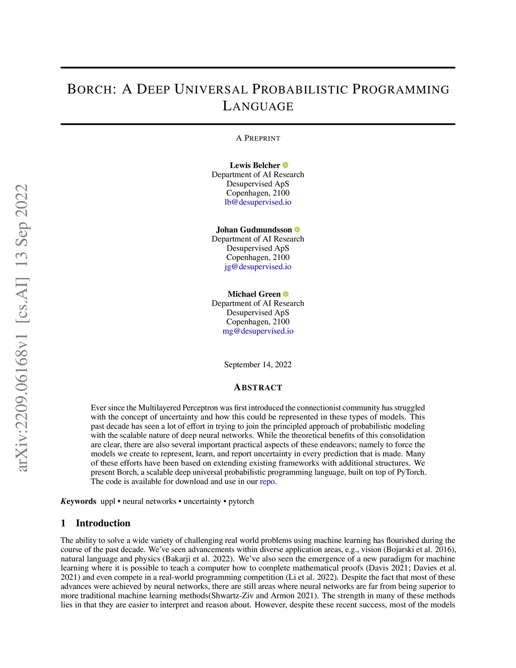 Ever since the Multilayered Perceptron was first introduced the connectionist community has struggled with the concept of uncertainty and how this could be represented in these types of models. This past decade has seen a lot of effort in trying to join the principled approach of probabilistic modeling with the scalable nature of deep neural networks. While the theoretical benefits of this consolidation are clear, there are also several important practical aspects of these endeavors; namely to force the models we create to represent, learn, and report uncertainty in every prediction that is made. Many of these efforts have been based on extending existing frameworks with additional structures. We present Borch, a scalable deep universal probabilistic programming language, built on top of PyTorch. The code is available for download and use in our repository https://gitlab.com/desupervised/borch.