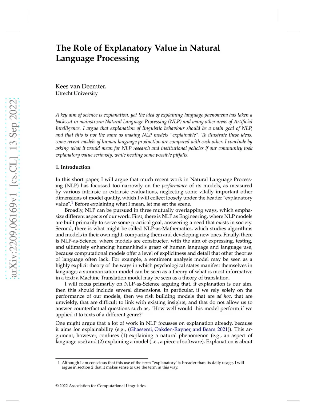 A key aim of science is explanation, yet the idea of explaining language phenomena has taken a backseat in mainstream Natural Language Processing (NLP) and many other areas of Artificial Intelligence. I argue that explanation of linguistic behaviour should be a main goal of NLP, and that this is not the same as making NLP models explainable. To illustrate these ideas, some recent models of human language production are compared with each other. I conclude by asking what it would mean for NLP research and institutional policies if our community took explanatory value seriously, while heeding some possible pitfalls.