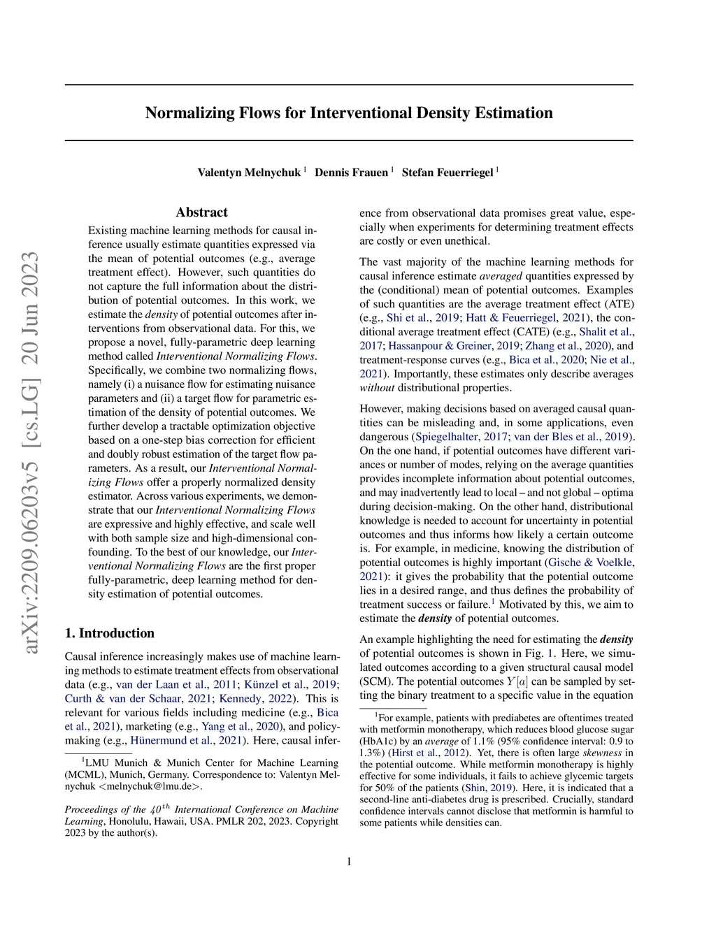 Existing machine learning methods for causal inference usually estimate quantities expressed via the mean of potential outcomes (e.g., average treatment effect). However, such quantities do not capture the full information about the distribution of potential outcomes. In this work, we estimate the density of potential outcomes after interventions from observational data. For this, we propose a novel, fully-parametric deep learning method called Interventional Normalizing Flows. Specifically, we combine two normalizing flows, namely (i) a nuisance flow for estimating nuisance parameters and (ii) a target flow for parametric estimation of the density of potential outcomes. We further develop a tractable optimization objective based on a one-step bias correction for efficient and doubly robust estimation of the target flow parameters. As a result, our Interventional Normalizing Flows offer a properly normalized density estimator. Across various experiments, we demonstrate that our Interventional Normalizing Flows are expressive and highly effective, and scale well with both sample size and high-dimensional confounding. To the best of our knowledge, our Interventional Normalizing Flows are the first proper fully-parametric, deep learning method for density estimation of potential outcomes.
