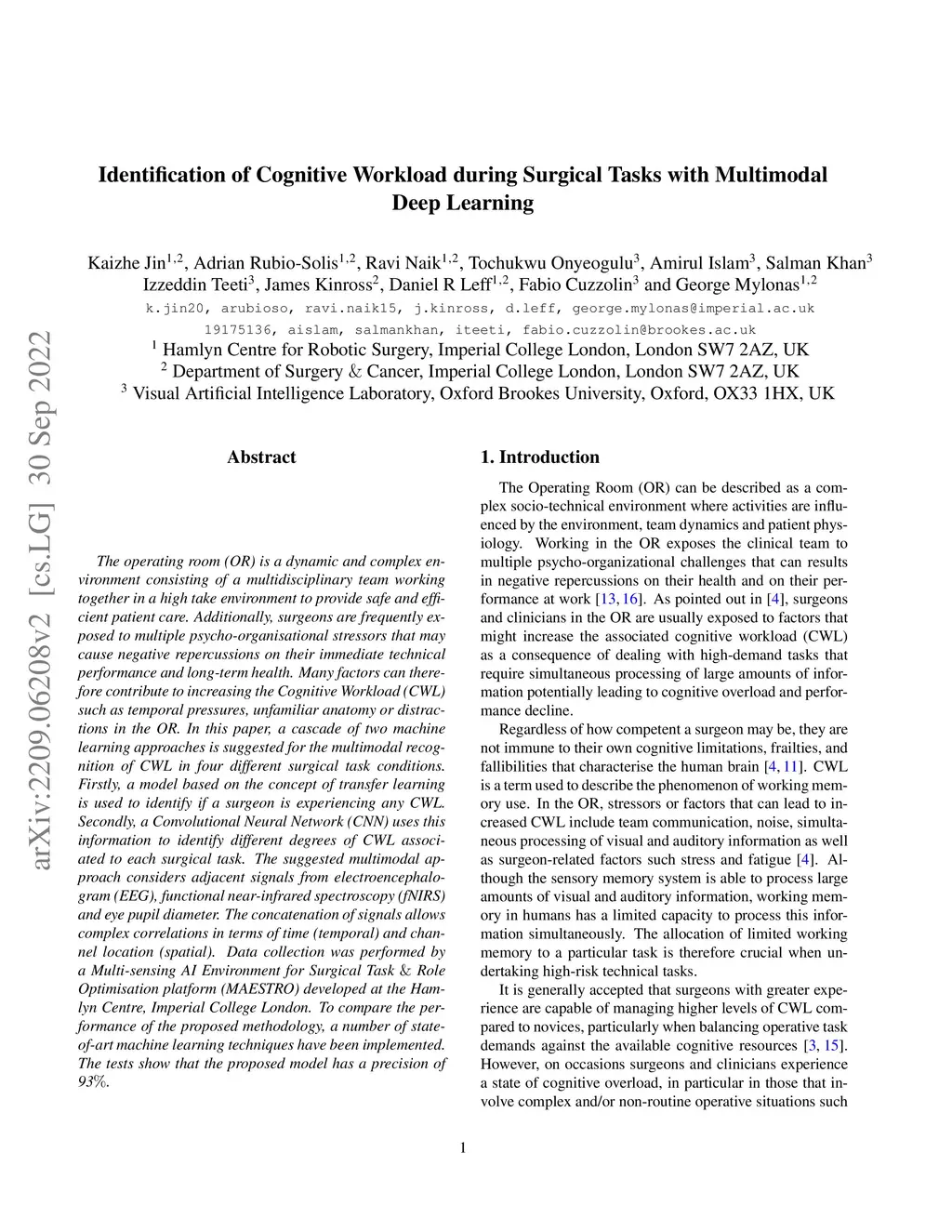 The operating room (OR) is a dynamic and complex environment consisting of a multidisciplinary team working together in a high take environment to provide safe and efficient patient care. Additionally, surgeons are frequently exposed to multiple psycho-organisational stressors that may cause negative repercussions on their immediate technical performance and long-term health. Many factors can therefore contribute to increasing the Cognitive Workload (CWL) such as temporal pressures, unfamiliar anatomy or distractions in the OR. In this paper, a cascade of two machine learning approaches is suggested for the multimodal recognition of CWL in four different surgical task conditions. Firstly, a model based on the concept of transfer learning is used to identify if a surgeon is experiencing any CWL. Secondly, a Convolutional Neural Network (CNN) uses this information to identify different degrees of CWL associated to each surgical task. The suggested multimodal approach considers adjacent signals from electroencephalogram (EEG), functional near-infrared spectroscopy (fNIRS) and eye pupil diameter. The concatenation of signals allows complex correlations in terms of time (temporal) and channel location (spatial). Data collection was performed by a Multi-sensing AI Environment for Surgical Task & Role Optimisation platform (MAESTRO) developed at the Hamlyn Centre, Imperial College London. To compare the performance of the proposed methodology, a number of state-of-art machine learning techniques have been implemented. The tests show that the proposed model has a precision of 93%.