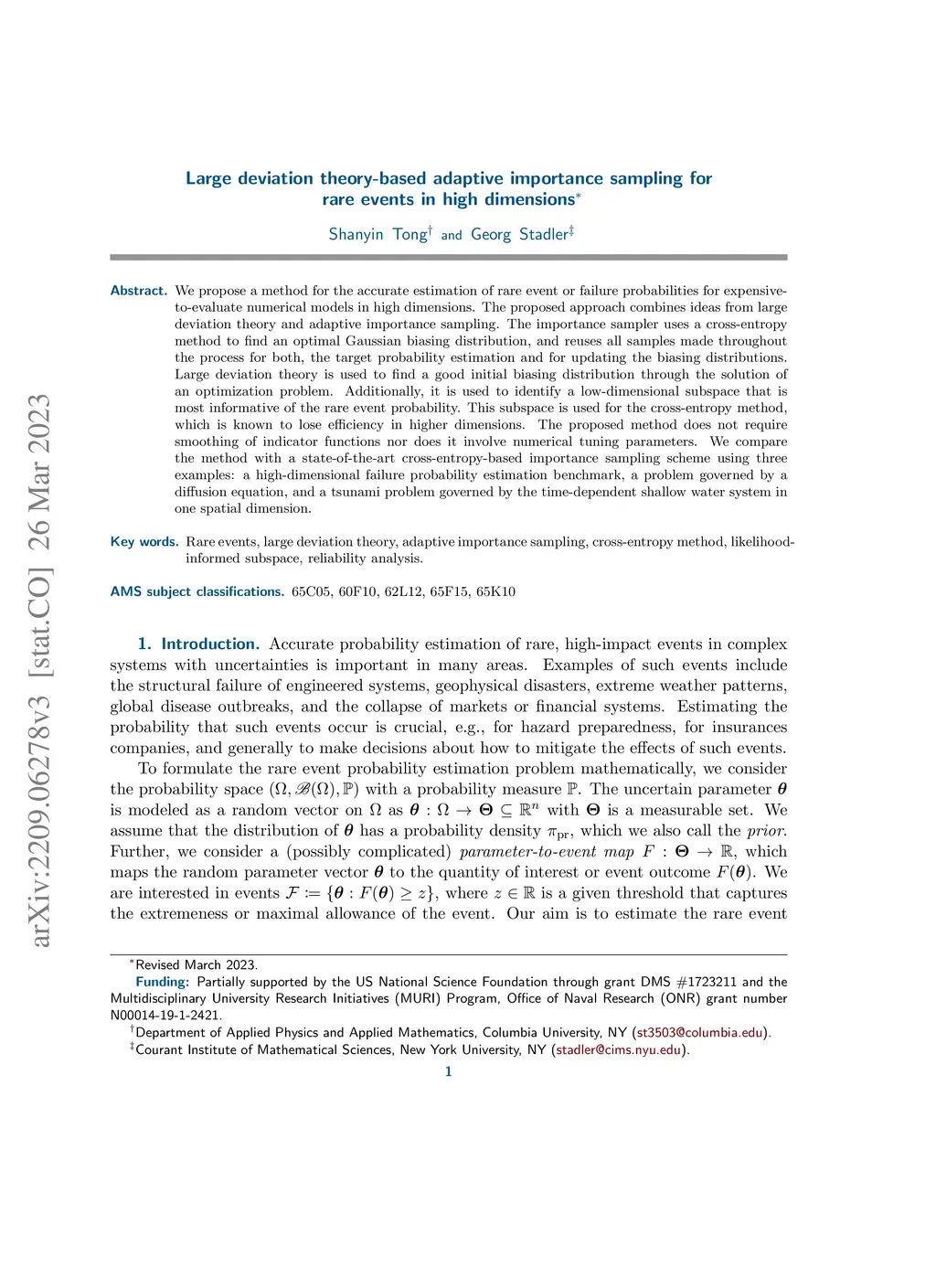 Large deviation theory-based adaptive importance sampling for rare