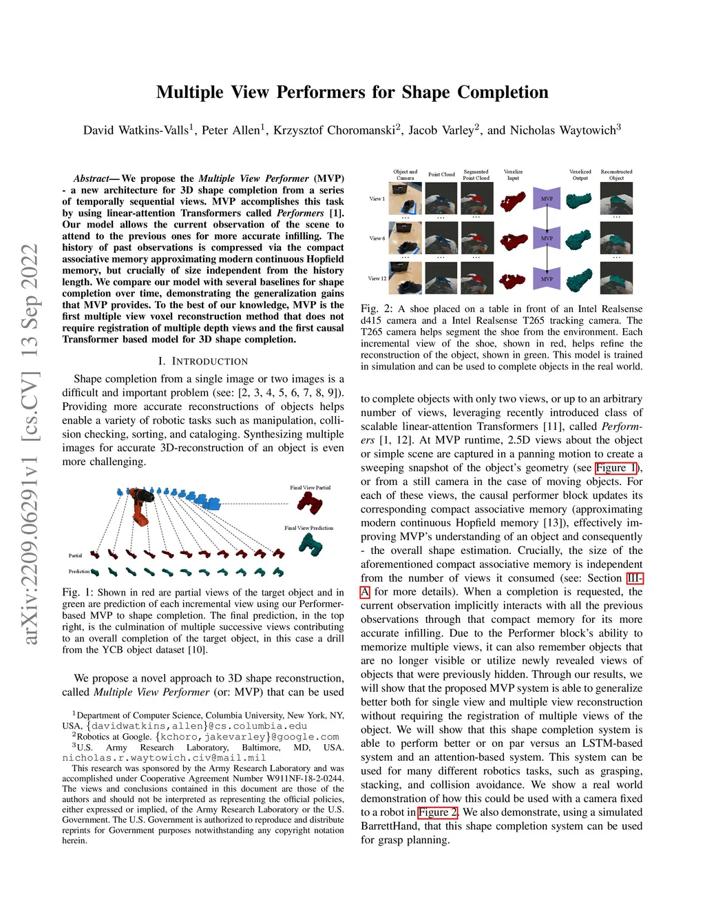 We propose the Multiple View Performer (MVP) - a new architecture for 3D shape completion from a series of temporally sequential views. MVP accomplishes this task by using linear-attention Transformers called Performers. Our model allows the current observation of the scene to attend to the previous ones for more accurate infilling. The history of past observations is compressed via the compact associative memory approximating modern continuous Hopfield memory, but crucially of size independent from the history length. We compare our model with several baselines for shape completion over time, demonstrating the generalization gains that MVP provides. To the best of our knowledge, MVP is the first multiple view voxel reconstruction method that does not require registration of multiple depth views and the first causal Transformer based model for 3D shape completion.