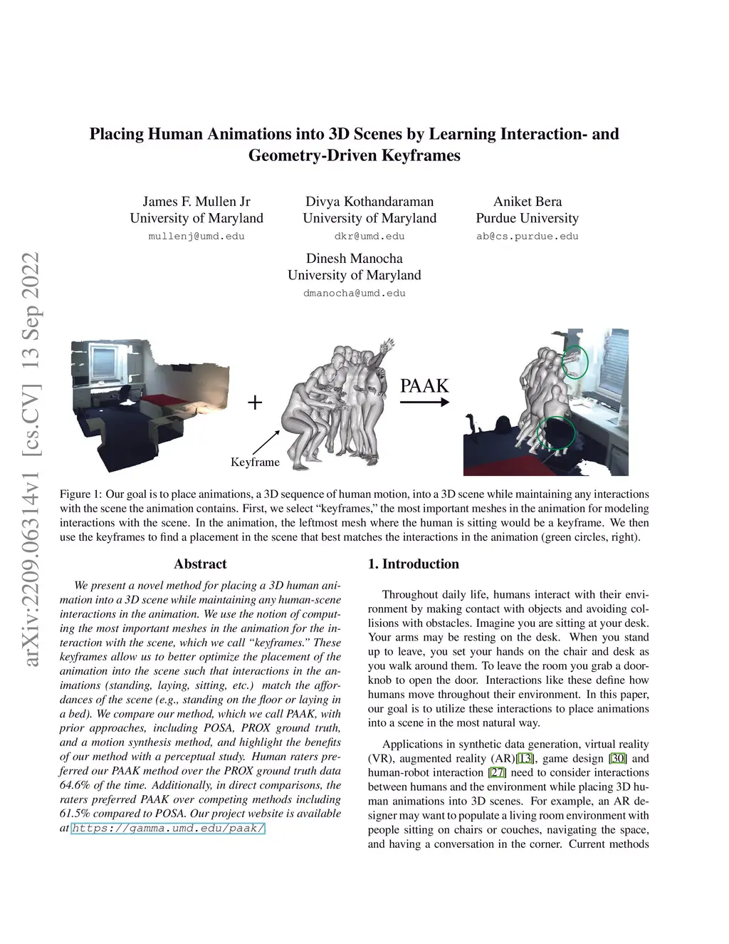We present a novel method for placing a 3D human animation into a 3D scene while maintaining any human-scene interactions in the animation. We use the notion of computing the most important meshes in the animation for the interaction with the scene, which we call "keyframes." These keyframes allow us to better optimize the placement of the animation into the scene such that interactions in the animations (standing, laying, sitting, etc.) match the affordances of the scene (e.g., standing on the floor or laying in a bed). We compare our method, which we call PAAK, with prior approaches, including POSA, PROX ground truth, and a motion synthesis method, and highlight the benefits of our method with a perceptual study. Human raters preferred our PAAK method over the PROX ground truth data 64.6\% of the time. Additionally, in direct comparisons, the raters preferred PAAK over competing methods including 61.5\% compared to POSA.