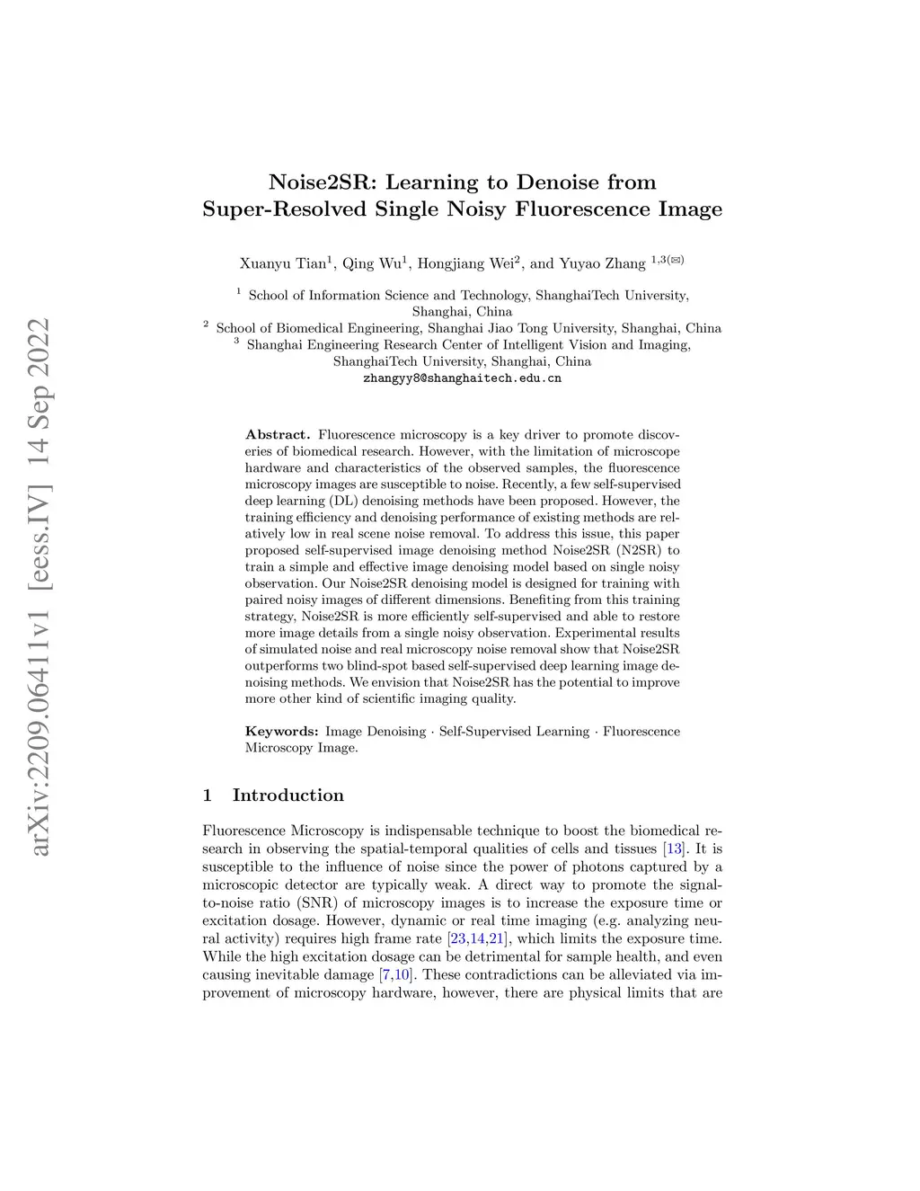 Fluorescence microscopy is a key driver to promote discoveries of biomedical research. However, with the limitation of microscope hardware and characteristics of the observed samples, the fluorescence microscopy images are susceptible to noise. Recently, a few self-supervised deep learning (DL) denoising methods have been proposed. However, the training efficiency and denoising performance of existing methods are relatively low in real scene noise removal. To address this issue, this paper proposed self-supervised image denoising method Noise2SR (N2SR) to train a simple and effective image denoising model based on single noisy observation. Our Noise2SR denoising model is designed for training with paired noisy images of different dimensions. Benefiting from this training strategy, Noise2SR is more efficiently self-supervised and able to restore more image details from a single noisy observation. Experimental results of simulated noise and real microscopy noise removal show that Noise2SR outperforms two blind-spot based self-supervised deep learning image denoising methods. We envision that Noise2SR has the potential to improve more other kind of scientific imaging quality.