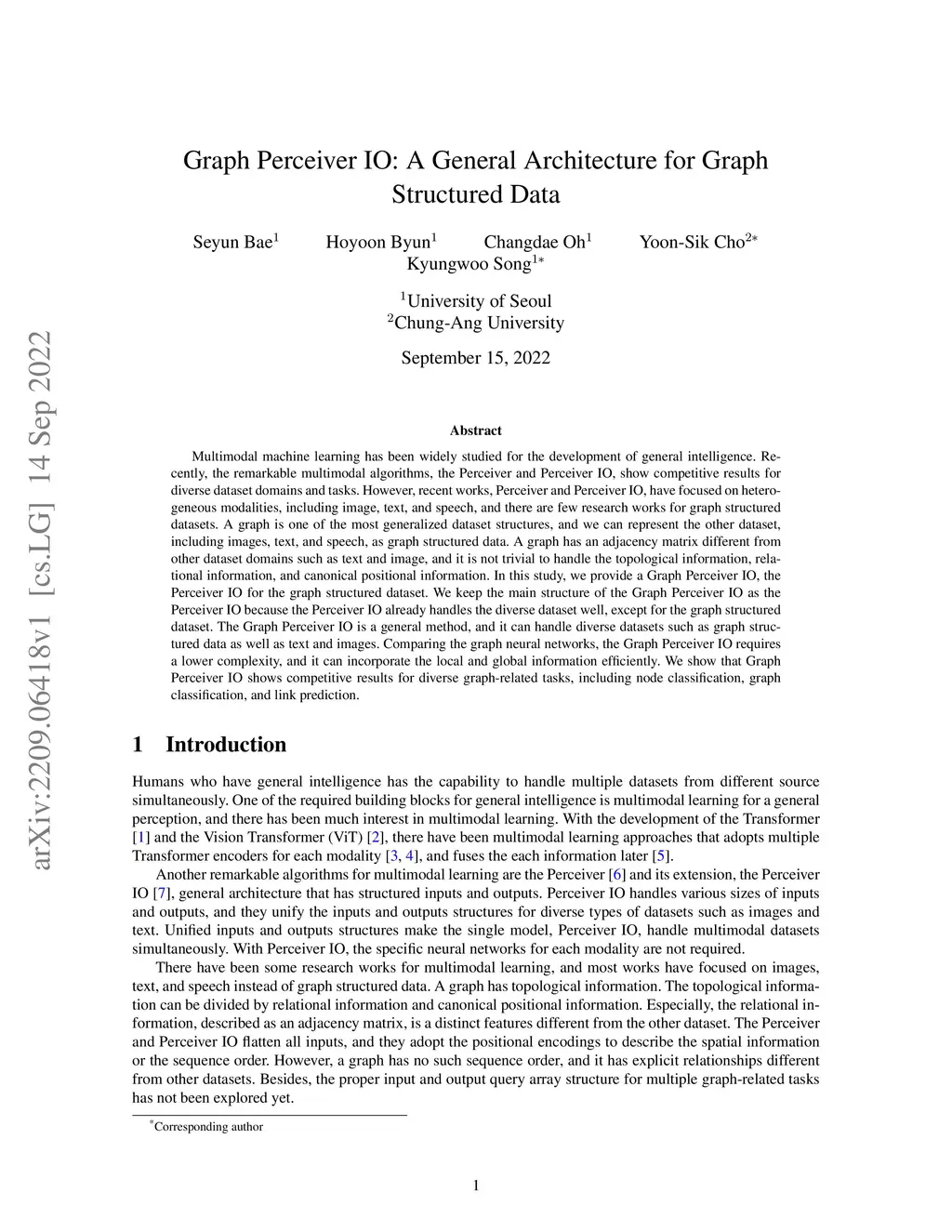 Multimodal machine learning has been widely studied for the development of general intelligence. Recently, the Perceiver and Perceiver IO, show competitive results for diverse dataset domains and tasks. However, recent works, Perceiver and Perceiver IO, have focused on heterogeneous modalities, including image, text, and there are few research works for graph structured datasets. A graph has an adjacency matrix different from other datasets such as text and image, and it is not trivial to handle the topological information. In this study, we provide a Graph Perceiver IO (GPIO), the Perceiver IO for the graph structured dataset. We keep the main structure of the GPIO as the Perceiver IO because the Perceiver IO already handles the diverse dataset well, except for the graph structured dataset. The GPIO is a general method that handles diverse datasets, such as graph-structured data, text, and images, by leveraging positional encoding and output query smoothing. Compared to graph neural networks (GNNs), GPIO requires lower complexity and can efficiently incorporate global and local information, which is also empirically validated through experiments. Furthermore, we propose GPIO+ for the multimodal few-shot classification that incorporates both images and graphs simultaneously. GPIO achieves higher benchmark accuracy than GNNs across multiple tasks, including graph classification, node classification, and multimodal text classification, while also attaining superior AP and AUC in link prediction. Additionally, GPIO+ outperforms GNNs in multimodal few-shot classification. Our GPIO(+) can serve as a general architecture for handling various modalities and tasks.