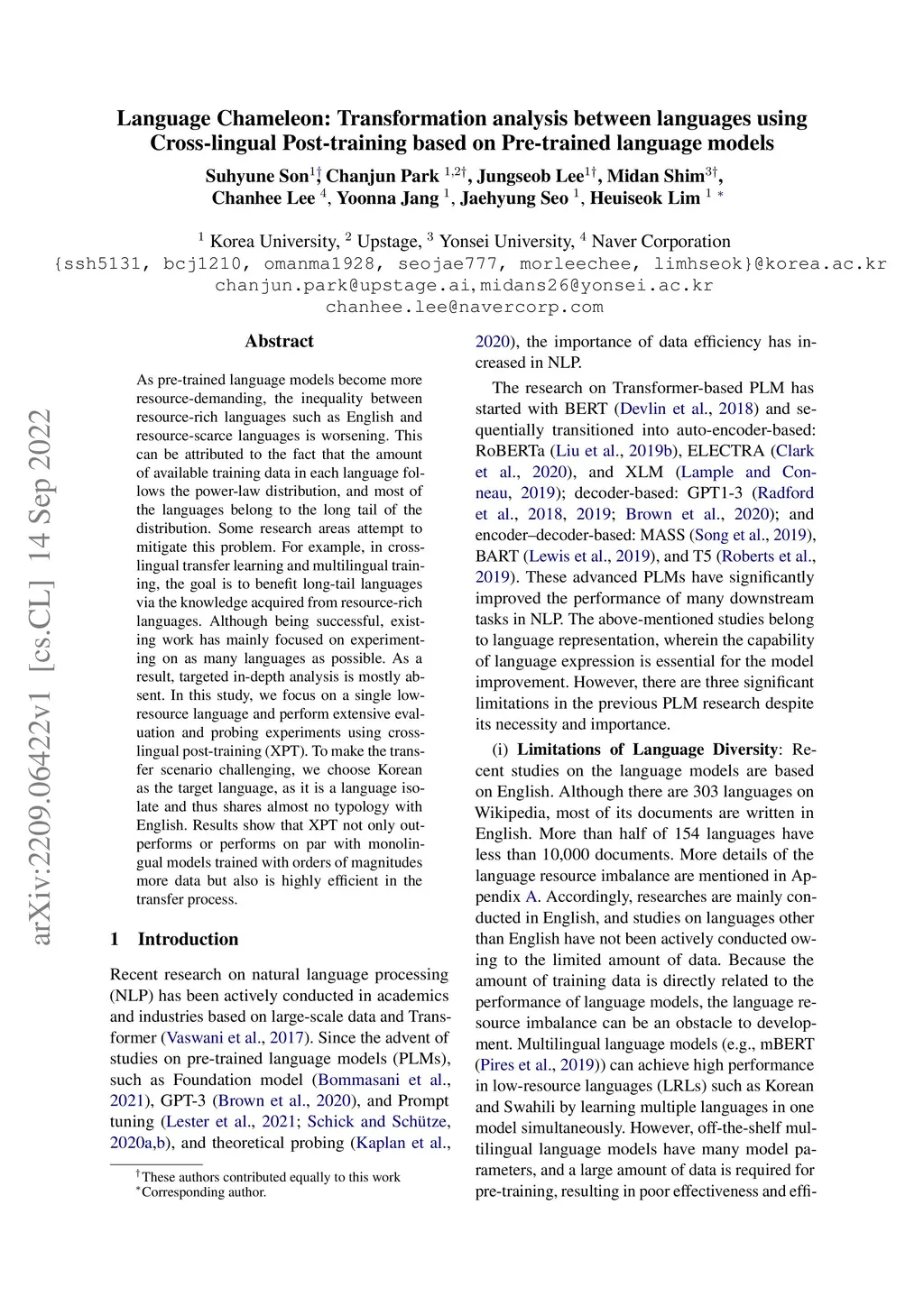 As pre-trained language models become more resource-demanding, the inequality between resource-rich languages such as English and resource-scarce languages is worsening. This can be attributed to the fact that the amount of available training data in each language follows the power-law distribution, and most of the languages belong to the long tail of the distribution. Some research areas attempt to mitigate this problem. For example, in cross-lingual transfer learning and multilingual training, the goal is to benefit long-tail languages via the knowledge acquired from resource-rich languages. Although being successful, existing work has mainly focused on experimenting on as many languages as possible. As a result, targeted in-depth analysis is mostly absent. In this study, we focus on a single low-resource language and perform extensive evaluation and probing experiments using cross-lingual post-training (XPT). To make the transfer scenario challenging, we choose Korean as the target language, as it is a language isolate and thus shares almost no typology with English. Results show that XPT not only outperforms or performs on par with monolingual models trained with orders of magnitudes more data but also is highly efficient in the transfer process.