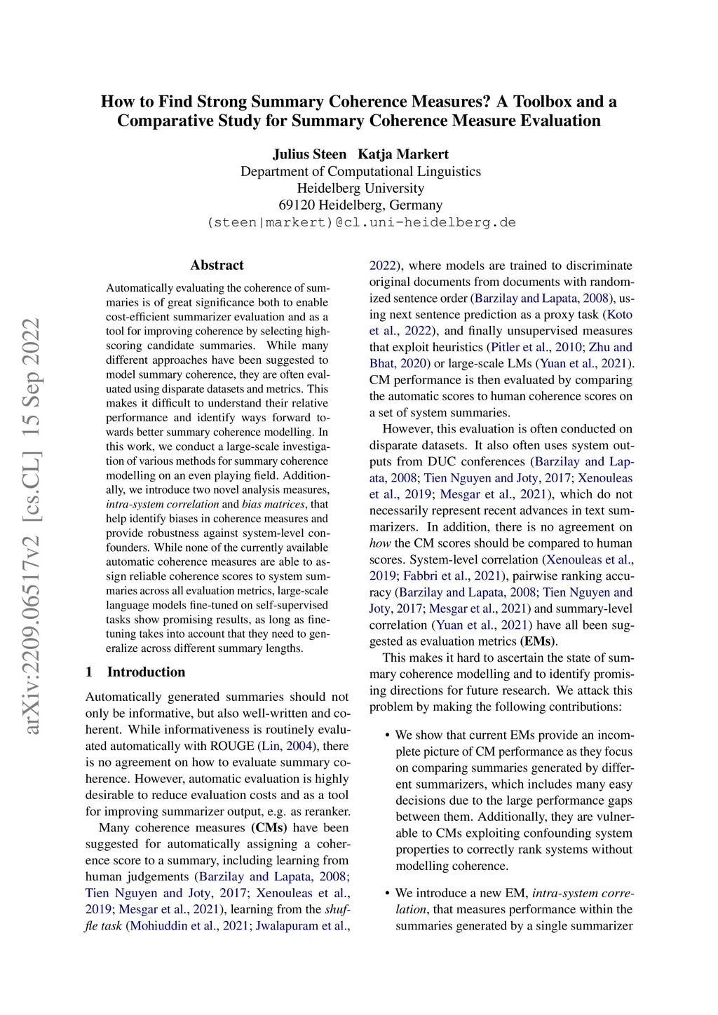 Automatically evaluating the coherence of summaries is of great significance both to enable cost-efficient summarizer evaluation and as a tool for improving coherence by selecting high-scoring candidate summaries. While many different approaches have been suggested to model summary coherence, they are often evaluated using disparate datasets and metrics. This makes it difficult to understand their relative performance and identify ways forward towards better summary coherence modelling. In this work, we conduct a large-scale investigation of various methods for summary coherence modelling on an even playing field. Additionally, we introduce two novel analysis measures, intra-system correlation and bias matrices, that help identify biases in coherence measures and provide robustness against system-level confounders. While none of the currently available automatic coherence measures are able to assign reliable coherence scores to system summaries across all evaluation metrics, large-scale language models fine-tuned on self-supervised tasks show promising results, as long as fine-tuning takes into account that they need to generalize across different summary lengths.