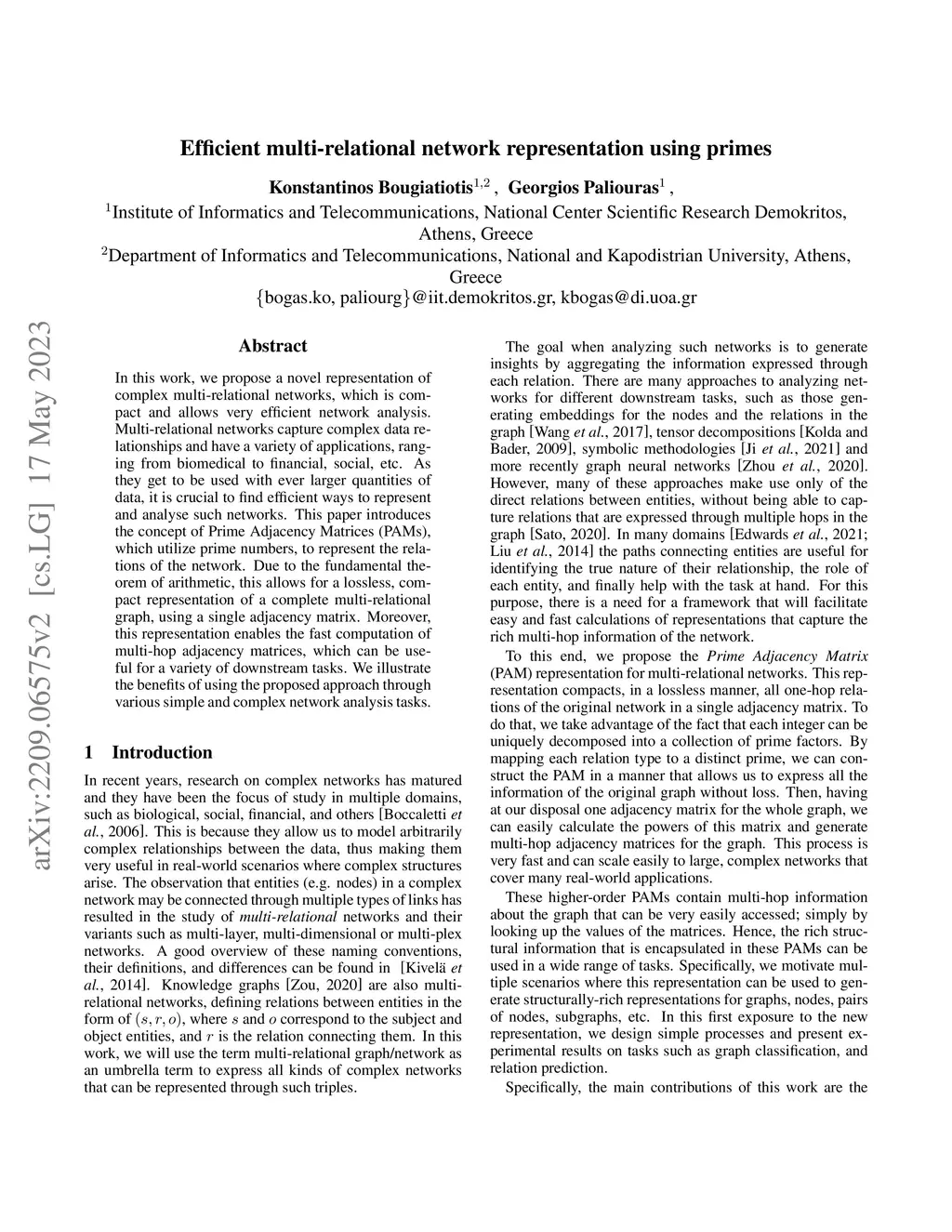 In this work, we propose a novel representation of complex multi-relational networks, which is compact and allows very efficient network analysis. Multi-relational networks capture complex data relationships and have a variety of applications, ranging from biomedical to financial, social, etc. As they get to be used with ever larger quantities of data, it is crucial to find efficient ways to represent and analyse such networks. This paper introduces the concept of Prime Adjacency Matrices (PAMs), which utilize prime numbers, to represent the relations of the network. Due to the fundamental theorem of arithmetic, this allows for a lossless, compact representation of a complete multi-relational graph, using a single adjacency matrix. Moreover, this representation enables the fast computation of multi-hop adjacency matrices, which can be useful for a variety of downstream tasks. We illustrate the benefits of using the proposed approach through various simple and complex network analysis tasks.