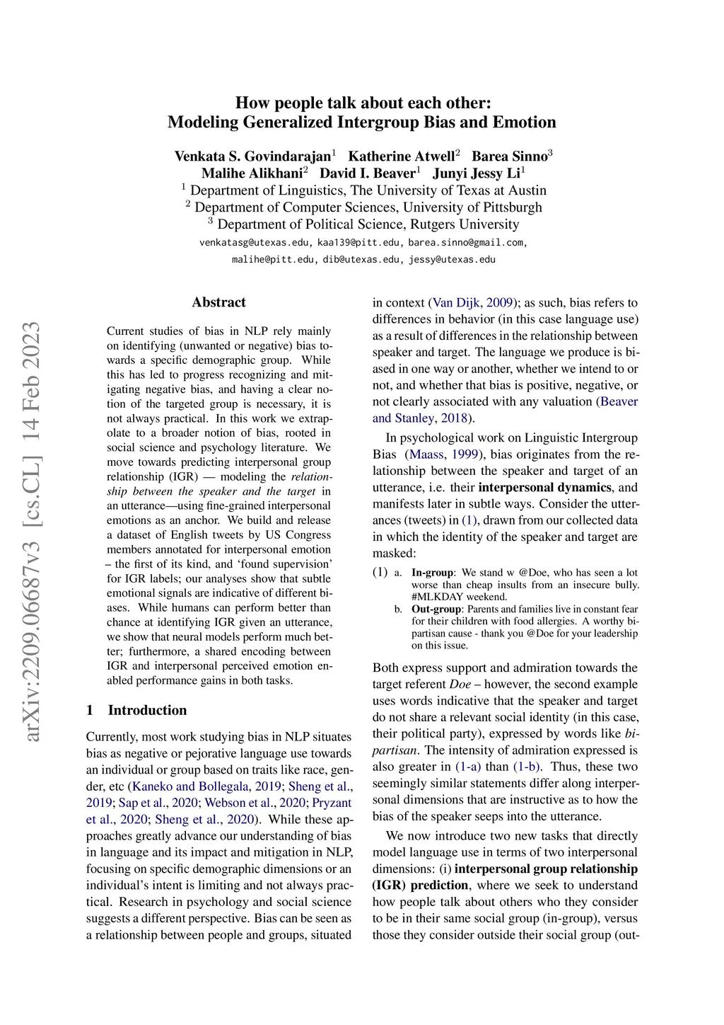 Current studies of bias in NLP rely mainly on identifying (unwanted or negative) bias towards a specific demographic group. While this has led to progress recognizing and mitigating negative bias, and having a clear notion of the targeted group is necessary, it is not always practical. In this work we extrapolate to a broader notion of bias, rooted in social science and psychology literature. We move towards predicting interpersonal group relationship (IGR) - modeling the relationship between the speaker and the target in an utterance - using fine-grained interpersonal emotions as an anchor. We build and release a dataset of English tweets by US Congress members annotated for interpersonal emotion -- the first of its kind, and 'found supervision' for IGR labels; our analyses show that subtle emotional signals are indicative of different biases. While humans can perform better than chance at identifying IGR given an utterance, we show that neural models perform much better; furthermore, a shared encoding between IGR and interpersonal perceived emotion enabled performance gains in both tasks. Data and code for this paper are available at https://github.com/venkatasg/interpersonal-bias