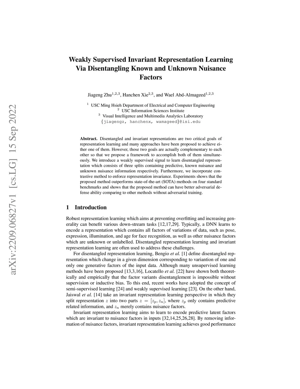 Weakly Supervised Invariant Representation Learning Via Disentangling