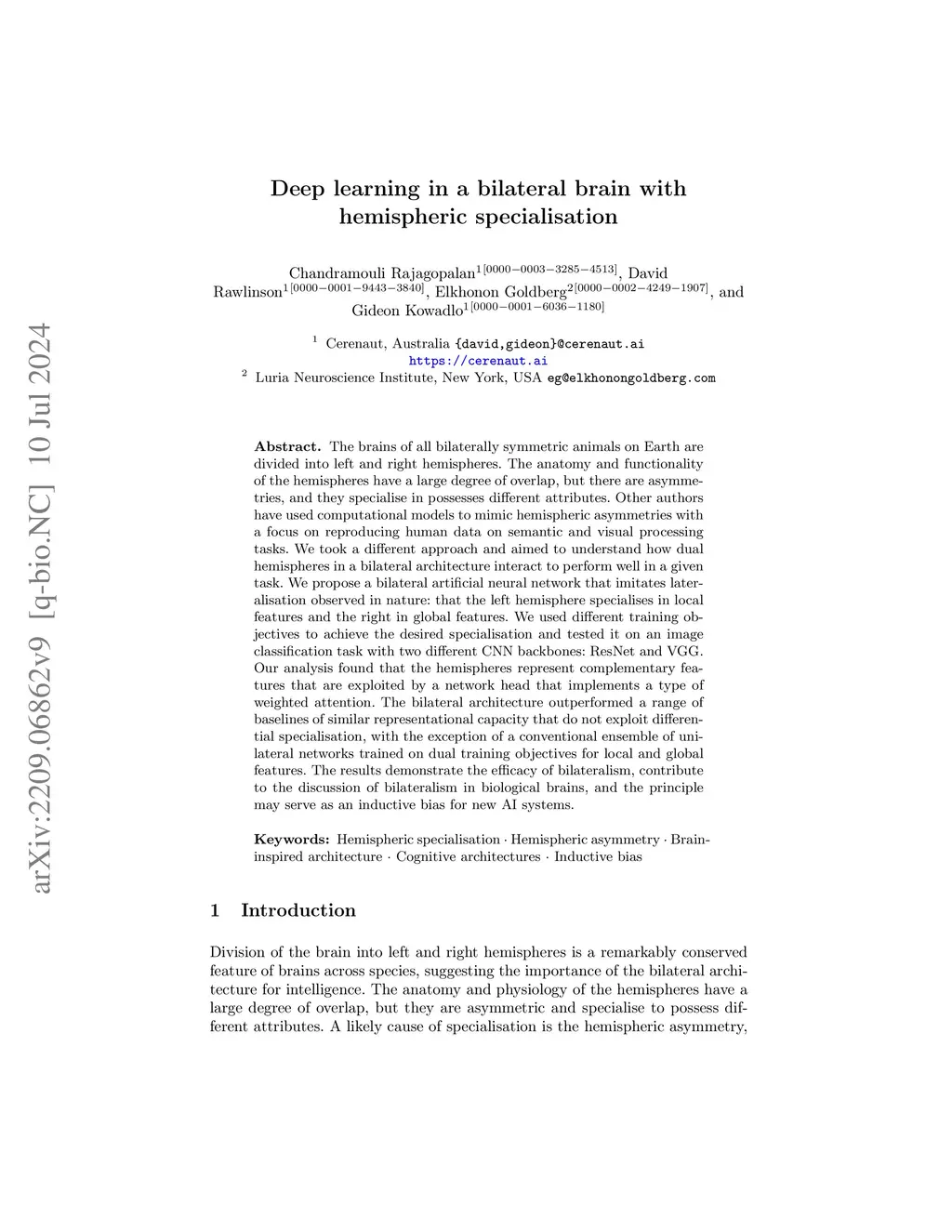 The brains of all bilaterally symmetric animals on Earth are divided into left and right hemispheres. The anatomy and functionality of the hemispheres have a large degree of overlap, but there are asymmetries, and they specialise in possesses different attributes. Other authors have used computational models to mimic hemispheric asymmetries with a focus on reproducing human data on semantic and visual processing tasks. We took a different approach and aimed to understand how dual hemispheres in a bilateral architecture interact to perform well in a given task. We propose a bilateral artificial neural network that imitates lateralisation observed in nature: that the left hemisphere specialises in local features and the right in global features. We used different training objectives to achieve the desired specialisation and tested it on an image classification task with two different CNN backbones: ResNet and VGG. Our analysis found that the hemispheres represent complementary features that are exploited by a network head that implements a type of weighted attention. The bilateral architecture outperformed a range of baselines of similar representational capacity that do not exploit differential specialisation, with the exception of a conventional ensemble of unilateral networks trained on dual training objectives for local and global features. The results demonstrate the efficacy of bilateralism, contribute to the discussion of bilateralism in biological brains, and the principle may serve as an inductive bias for new AI systems.