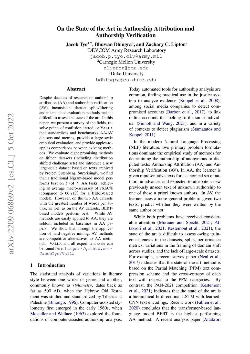Despite decades of research on authorship attribution (AA) and authorship verification (AV), inconsistent dataset splits/filtering and mismatched evaluation methods make it difficult to assess the state of the art. In this paper, we present a survey of the fields, resolve points of confusion, introduce Valla that standardizes and benchmarks AA/AV datasets and metrics, provide a large-scale empirical evaluation, and provide apples-to-apples comparisons between existing methods. We evaluate eight promising methods on fifteen datasets (including distribution-shifted challenge sets) and introduce a new large-scale dataset based on texts archived by Project Gutenberg. Surprisingly, we find that a traditional Ngram-based model performs best on 5 (of 7) AA tasks, achieving an average macro-accuracy of (compared to for a BERT-based model). However, on the two AA datasets with the greatest number of words per author, as well as on the AV datasets, BERT-based models perform best. While AV methods are easily applied to AA, they are seldom included as baselines in AA papers. We show that through the application of hard-negative mining, AV methods are competitive alternatives to AA methods. Valla and all experiment code can be found here: https://github.com/JacobTyo/Valla