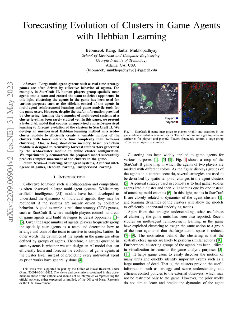 Large multi-agent systems such as real-time strategy games are often driven by collective behavior of agents. For example, in StarCraft II, human players group spatially near agents into a team and control the team to defeat opponents. In this light, clustering the agents in the game has been used for various purposes such as the efficient control of the agents in multi-agent reinforcement learning and game analytic tools for the game users. However, despite the useful information provided by clustering, learning the dynamics of multi-agent systems at a cluster level has been rarely studied yet. In this paper, we present a hybrid AI model that couples unsupervised and self-supervised learning to forecast evolution of the clusters in StarCraft II. We develop an unsupervised Hebbian learning method in a set-to-cluster module to efficiently create a variable number of the clusters with lower inference time complexity than K-means clustering. Also, a long short-term memory based prediction module is designed to recursively forecast state vectors generated by the set-to-cluster module to define cluster configuration. We experimentally demonstrate the proposed model successfully predicts complex movement of the clusters in the game.