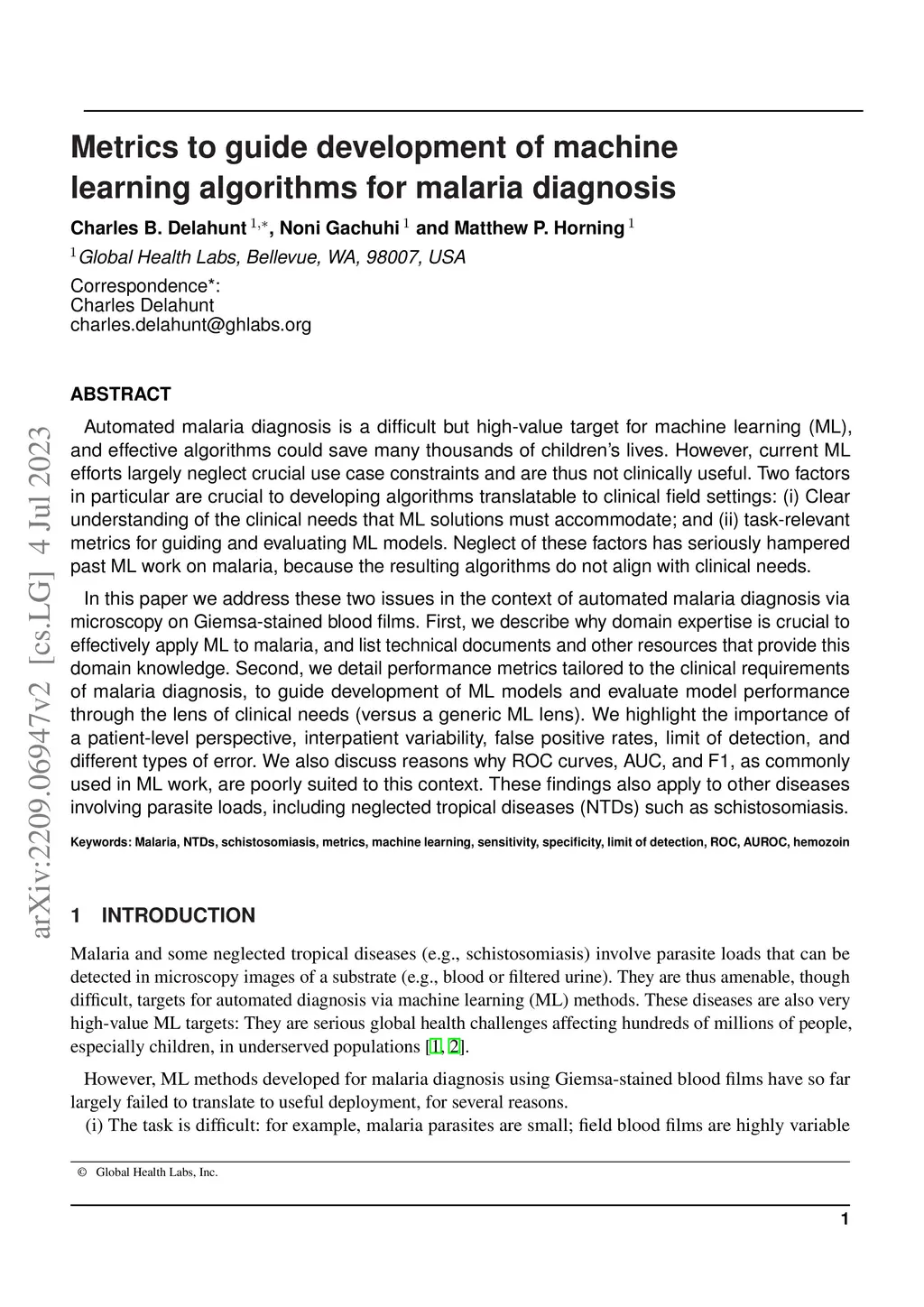 Metrics to guide development of machine learning algorithms for malaria