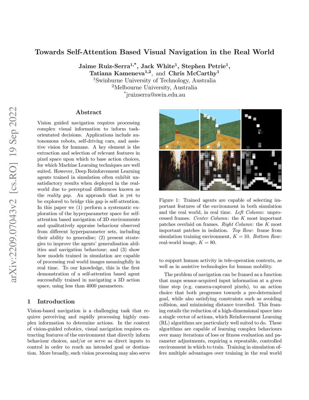 Vision guided navigation requires processing complex visual information to inform task-orientated decisions. Applications include autonomous robots, self-driving cars, and assistive vision for humans. A key element is the extraction and selection of relevant features in pixel space upon which to base action choices, for which Machine Learning techniques are well suited. However, Deep Reinforcement Learning agents trained in simulation often exhibit unsatisfactory results when deployed in the real-world due to perceptual differences known as the . An approach that is yet to be explored to bridge this gap is self-attention. In this paper we (1) perform a systematic exploration of the hyperparameter space for self-attention based navigation of 3D environments and qualitatively appraise behaviour observed from different hyperparameter sets, including their ability to generalise; (2) present strategies to improve the agents' generalisation abilities and navigation behaviour; and (3) show how models trained in simulation are capable of processing real world images meaningfully in real time. To our knowledge, this is the first demonstration of a self-attention based agent successfully trained in navigating a 3D action space, using less than 4000 parameters.