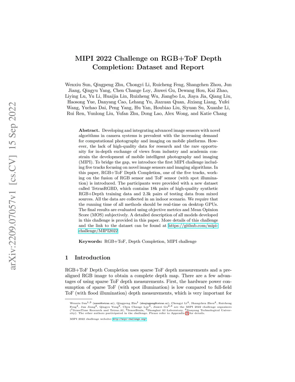 MIPI 2022 Challenge on RGB+ToF Depth Completion: Dataset and Report
