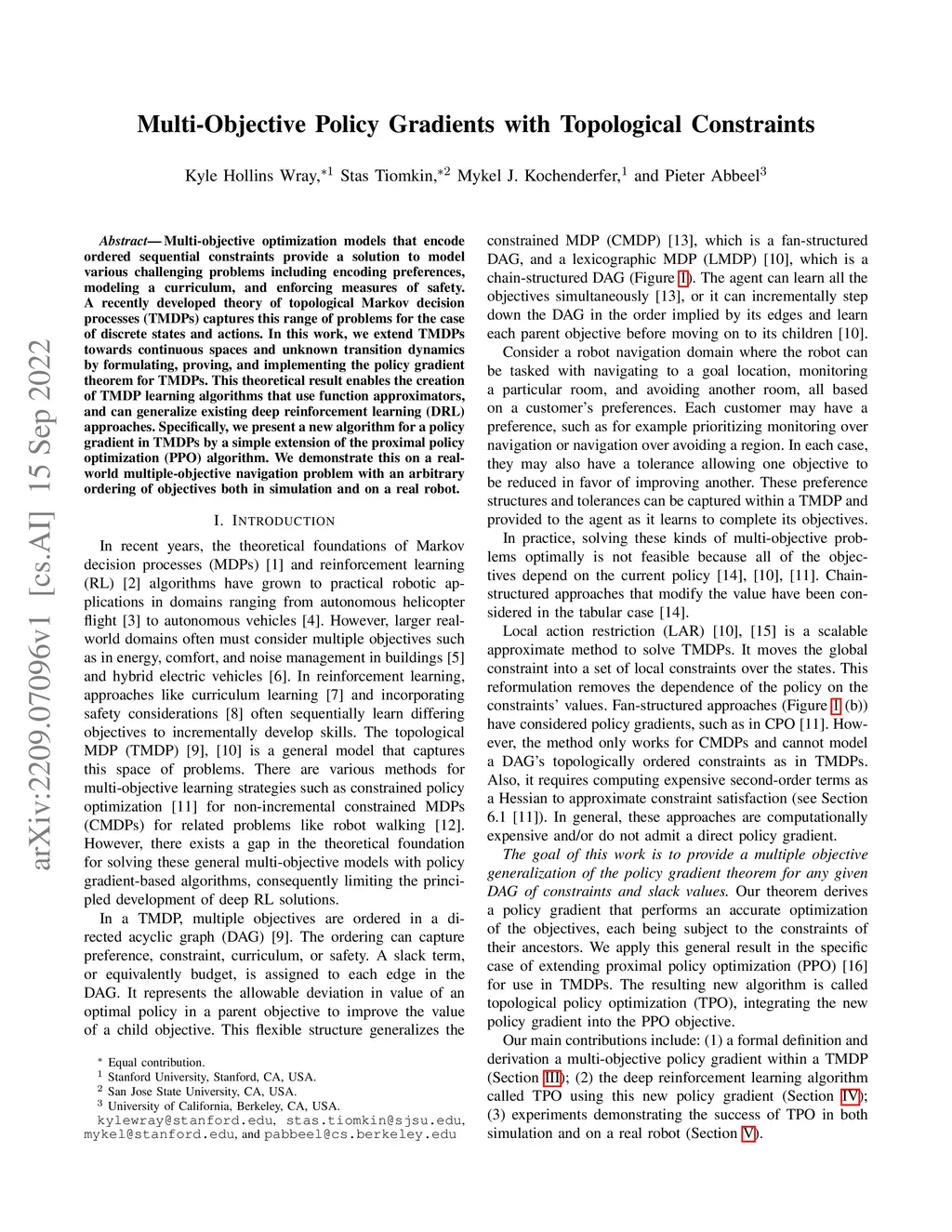 Multi-objective optimization models that encode ordered sequential constraints provide a solution to model various challenging problems including encoding preferences, modeling a curriculum, and enforcing measures of safety. A recently developed theory of topological Markov decision processes (TMDPs) captures this range of problems for the case of discrete states and actions. In this work, we extend TMDPs towards continuous spaces and unknown transition dynamics by formulating, proving, and implementing the policy gradient theorem for TMDPs. This theoretical result enables the creation of TMDP learning algorithms that use function approximators, and can generalize existing deep reinforcement learning (DRL) approaches. Specifically, we present a new algorithm for a policy gradient in TMDPs by a simple extension of the proximal policy optimization (PPO) algorithm. We demonstrate this on a real-world multiple-objective navigation problem with an arbitrary ordering of objectives both in simulation and on a real robot.