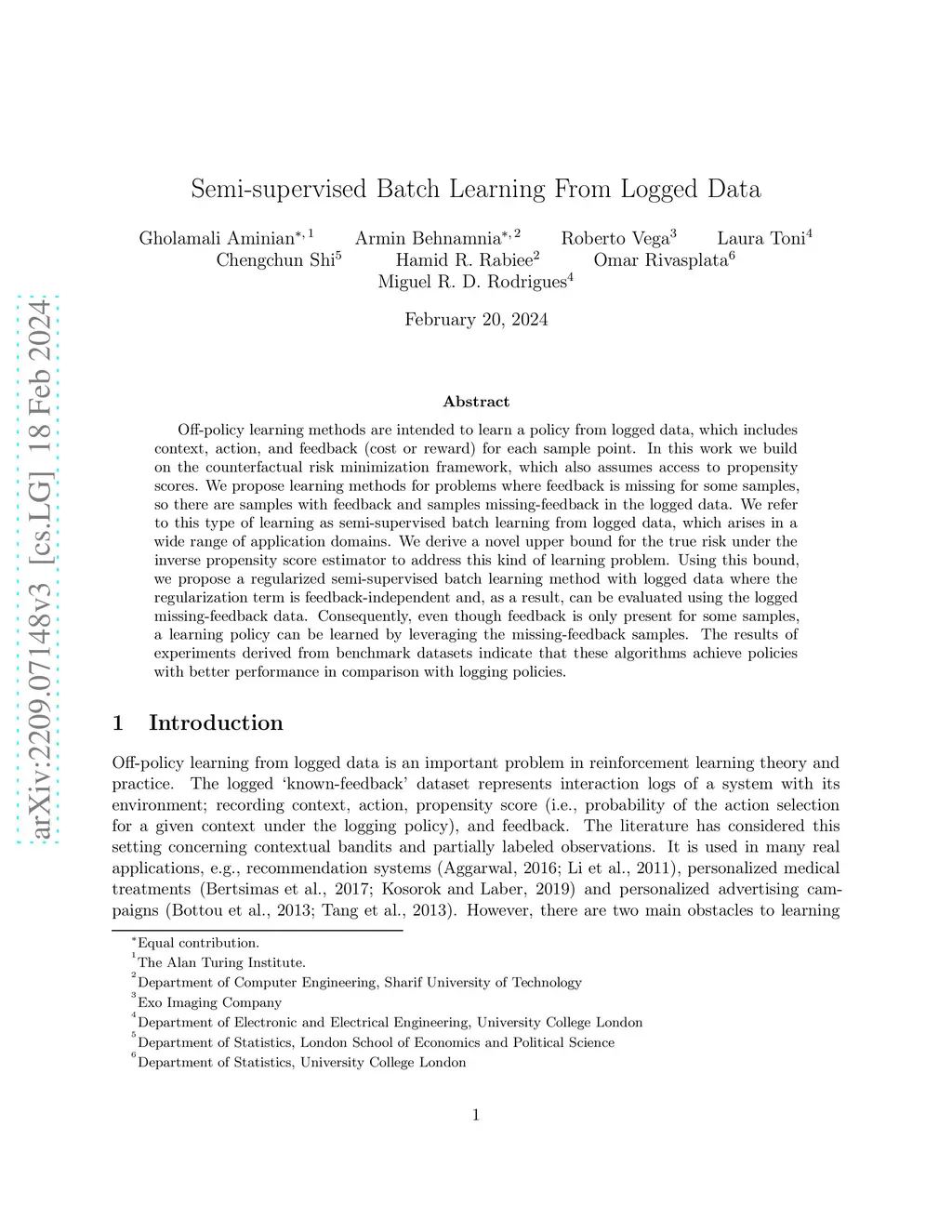 Off-policy learning methods are intended to learn a policy from logged data, which includes context, action, and feedback (cost or reward) for each sample point. In this work, we build on the counterfactual risk minimization framework, which also assumes access to propensity scores. We propose learning methods for problems where feedback is missing for some samples, so there are samples with feedback and samples missing-feedback in the logged data. We refer to this type of learning as semi-supervised batch learning from logged data, which arises in a wide range of application domains. We derive a novel upper bound for the true risk under the inverse propensity score estimator to address this kind of learning problem. Using this bound, we propose a regularized semi-supervised batch learning method with logged data where the regularization term is feedback-independent and, as a result, can be evaluated using the logged missing-feedback data. Consequently, even though feedback is only present for some samples, a learning policy can be learned by leveraging the missing-feedback samples. The results of experiments derived from benchmark datasets indicate that these algorithms achieve policies with better performance in comparison with logging policies.