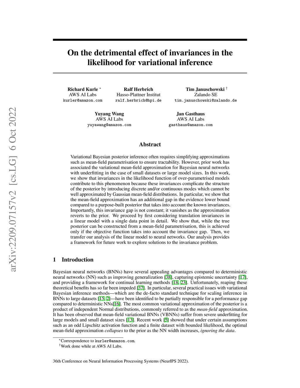 Variational Bayesian posterior inference often requires simplifying approximations such as mean-field parametrisation to ensure tractability. However, prior work has associated the variational mean-field approximation for Bayesian neural networks with underfitting in the case of small datasets or large model sizes. In this work, we show that invariances in the likelihood function of over-parametrised models contribute to this phenomenon because these invariances complicate the structure of the posterior by introducing discrete and/or continuous modes which cannot be well approximated by Gaussian mean-field distributions. In particular, we show that the mean-field approximation has an additional gap in the evidence lower bound compared to a purpose-built posterior that takes into account the known invariances. Importantly, this invariance gap is not constant; it vanishes as the approximation reverts to the prior. We proceed by first considering translation invariances in a linear model with a single data point in detail. We show that, while the true posterior can be constructed from a mean-field parametrisation, this is achieved only if the objective function takes into account the invariance gap. Then, we transfer our analysis of the linear model to neural networks. Our analysis provides a framework for future work to explore solutions to the invariance problem.
