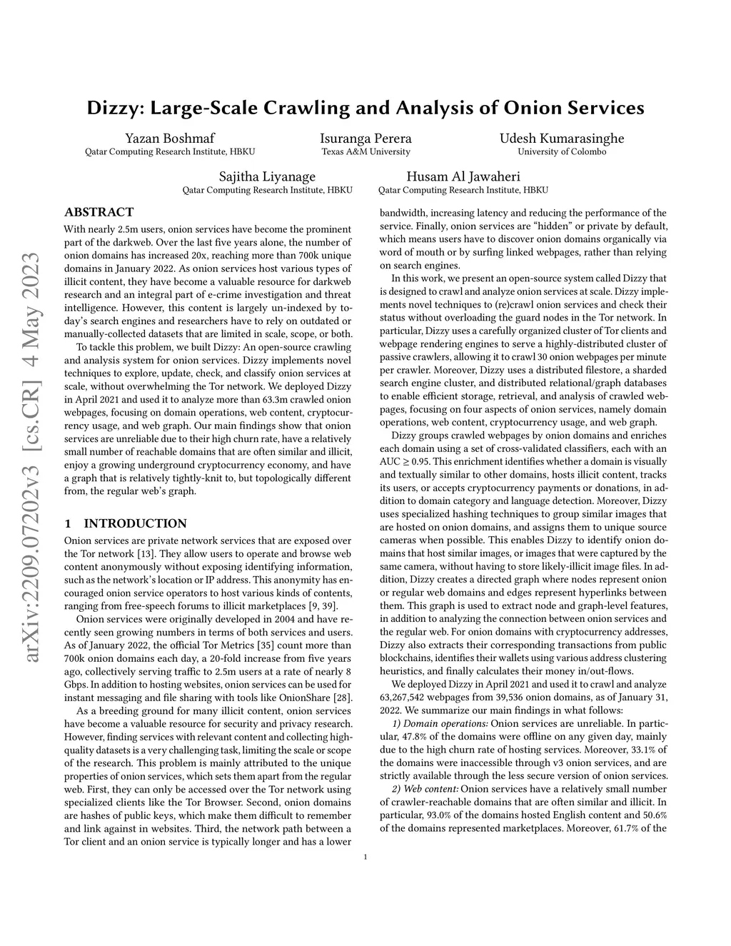 Dizzy: Large-Scale Crawling and Analysis of Onion Services