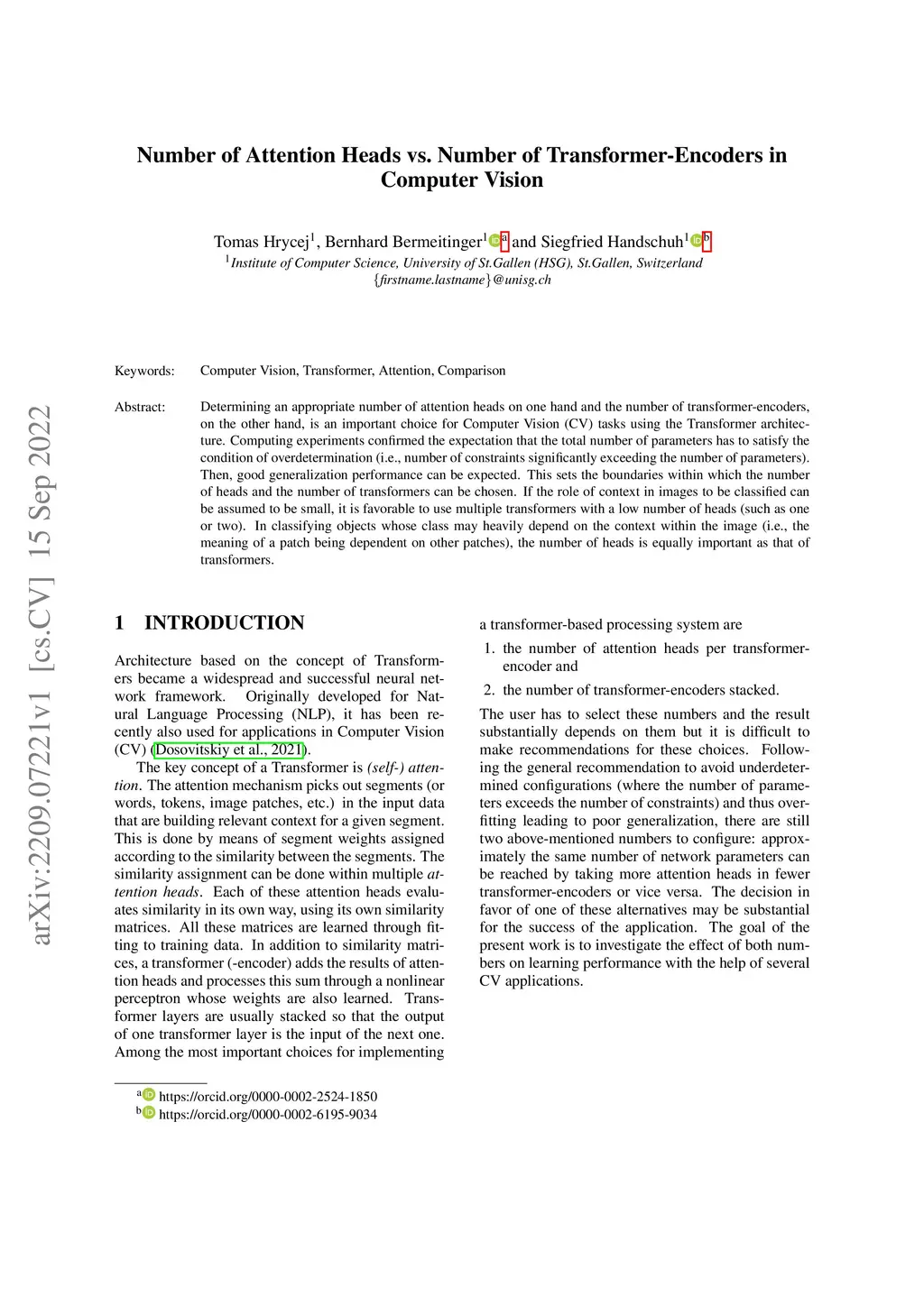Determining an appropriate number of attention heads on one hand and the number of transformer-encoders, on the other hand, is an important choice for Computer Vision (CV) tasks using the Transformer architecture. Computing experiments confirmed the expectation that the total number of parameters has to satisfy the condition of overdetermination (i.e., number of constraints significantly exceeding the number of parameters). Then, good generalization performance can be expected. This sets the boundaries within which the number of heads and the number of transformers can be chosen. If the role of context in images to be classified can be assumed to be small, it is favorable to use multiple transformers with a low number of heads (such as one or two). In classifying objects whose class may heavily depend on the context within the image (i.e., the meaning of a patch being dependent on other patches), the number of heads is equally important as that of transformers.