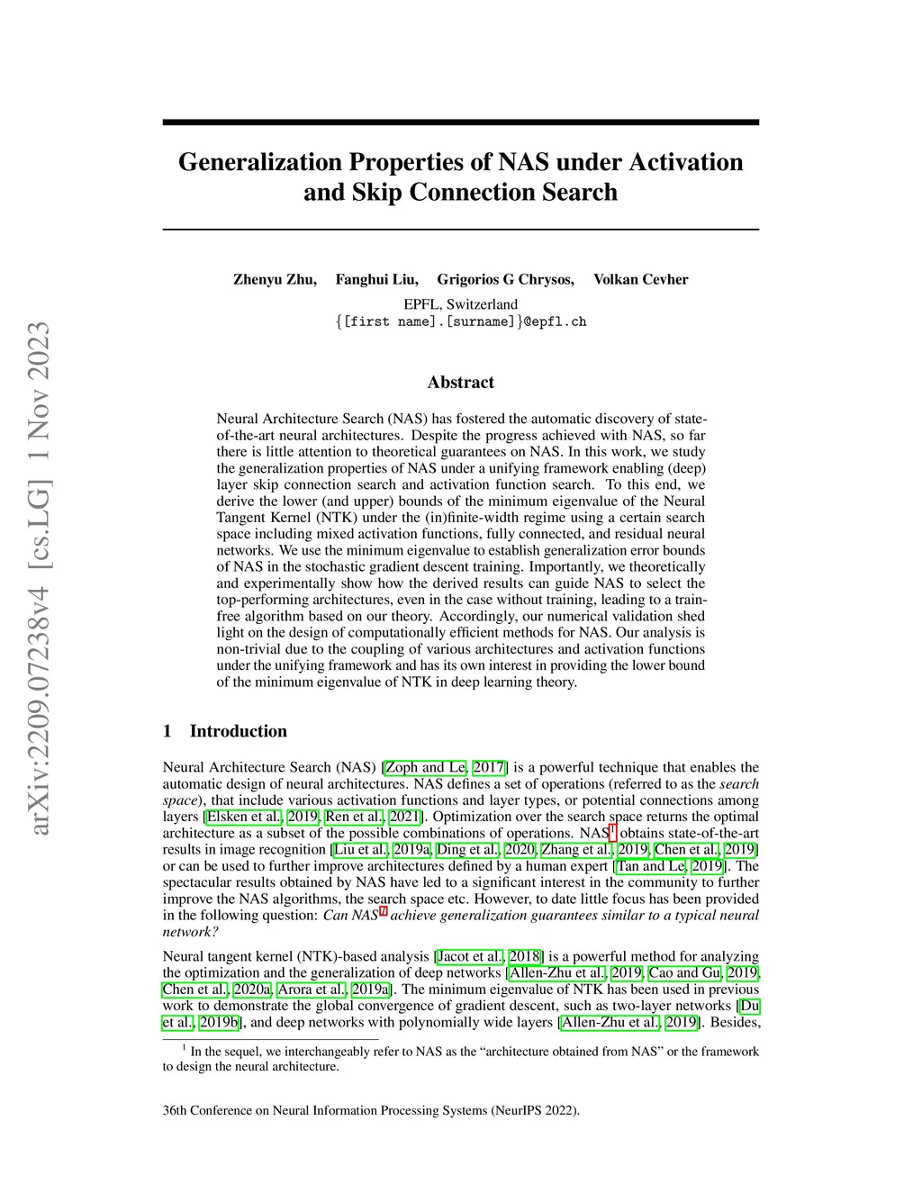 Neural Architecture Search (NAS) has fostered the automatic discovery of state-of-the-art neural architectures. Despite the progress achieved with NAS, so far there is little attention to theoretical guarantees on NAS. In this work, we study the generalization properties of NAS under a unifying framework enabling (deep) layer skip connection search and activation function search. To this end, we derive the lower (and upper) bounds of the minimum eigenvalue of the Neural Tangent Kernel (NTK) under the (in)finite-width regime using a certain search space including mixed activation functions, fully connected, and residual neural networks. We use the minimum eigenvalue to establish generalization error bounds of NAS in the stochastic gradient descent training. Importantly, we theoretically and experimentally show how the derived results can guide NAS to select the top-performing architectures, even in the case without training, leading to a train-free algorithm based on our theory. Accordingly, our numerical validation shed light on the design of computationally efficient methods for NAS. Our analysis is non-trivial due to the coupling of various architectures and activation functions under the unifying framework and has its own interest in providing the lower bound of the minimum eigenvalue of NTK in deep learning theory.