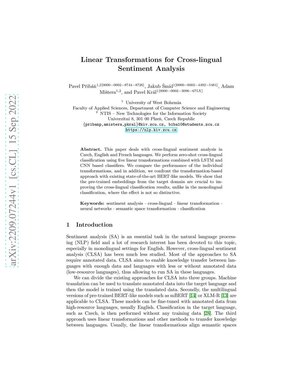 This paper deals with cross-lingual sentiment analysis in Czech, English and French languages. We perform zero-shot cross-lingual classification using five linear transformations combined with LSTM and CNN based classifiers. We compare the performance of the individual transformations, and in addition, we confront the transformation-based approach with existing state-of-the-art BERT-like models. We show that the pre-trained embeddings from the target domain are crucial to improving the cross-lingual classification results, unlike in the monolingual classification, where the effect is not so distinctive.