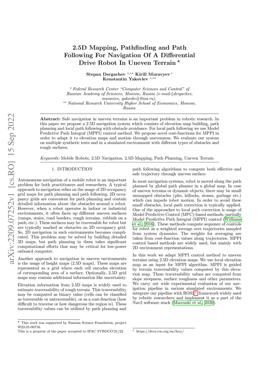 Safe navigation in uneven terrains is an important problem in robotic research. In this paper we propose a 2.5D navigation system which consists of elevation map building, path planning and local path following with obstacle avoidance. For local path following we use Model Predictive Path Integral (MPPI) control method. We propose novel cost-functions for MPPI in order to adapt it to elevation maps and motion through unevenness. We evaluate our system on multiple synthetic tests and in a simulated environment with different types of obstacles and rough surfaces.
