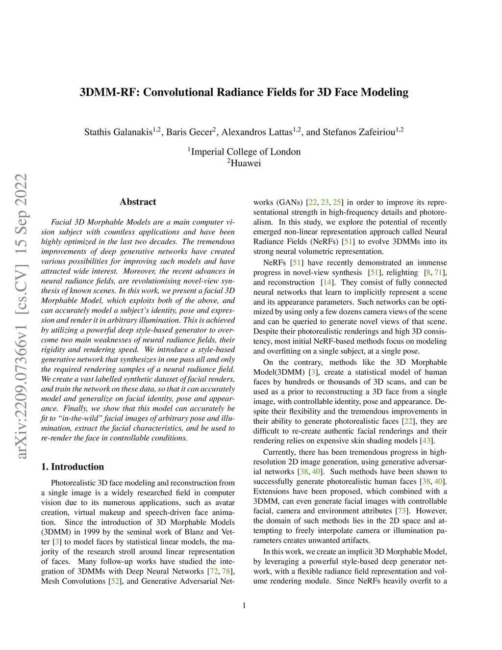 Facial 3D Morphable Models are a main computer vision subject with countless applications and have been highly optimized in the last two decades. The tremendous improvements of deep generative networks have created various possibilities for improving such models and have attracted wide interest. Moreover, the recent advances in neural radiance fields, are revolutionising novel-view synthesis of known scenes. In this work, we present a facial 3D Morphable Model, which exploits both of the above, and can accurately model a subject's identity, pose and expression and render it in arbitrary illumination. This is achieved by utilizing a powerful deep style-based generator to overcome two main weaknesses of neural radiance fields, their rigidity and rendering speed. We introduce a style-based generative network that synthesizes in one pass all and only the required rendering samples of a neural radiance field. We create a vast labelled synthetic dataset of facial renders, and train the network on these data, so that it can accurately model and generalize on facial identity, pose and appearance. Finally, we show that this model can accurately be fit to "in-the-wild" facial images of arbitrary pose and illumination, extract the facial characteristics, and be used to re-render the face in controllable conditions.