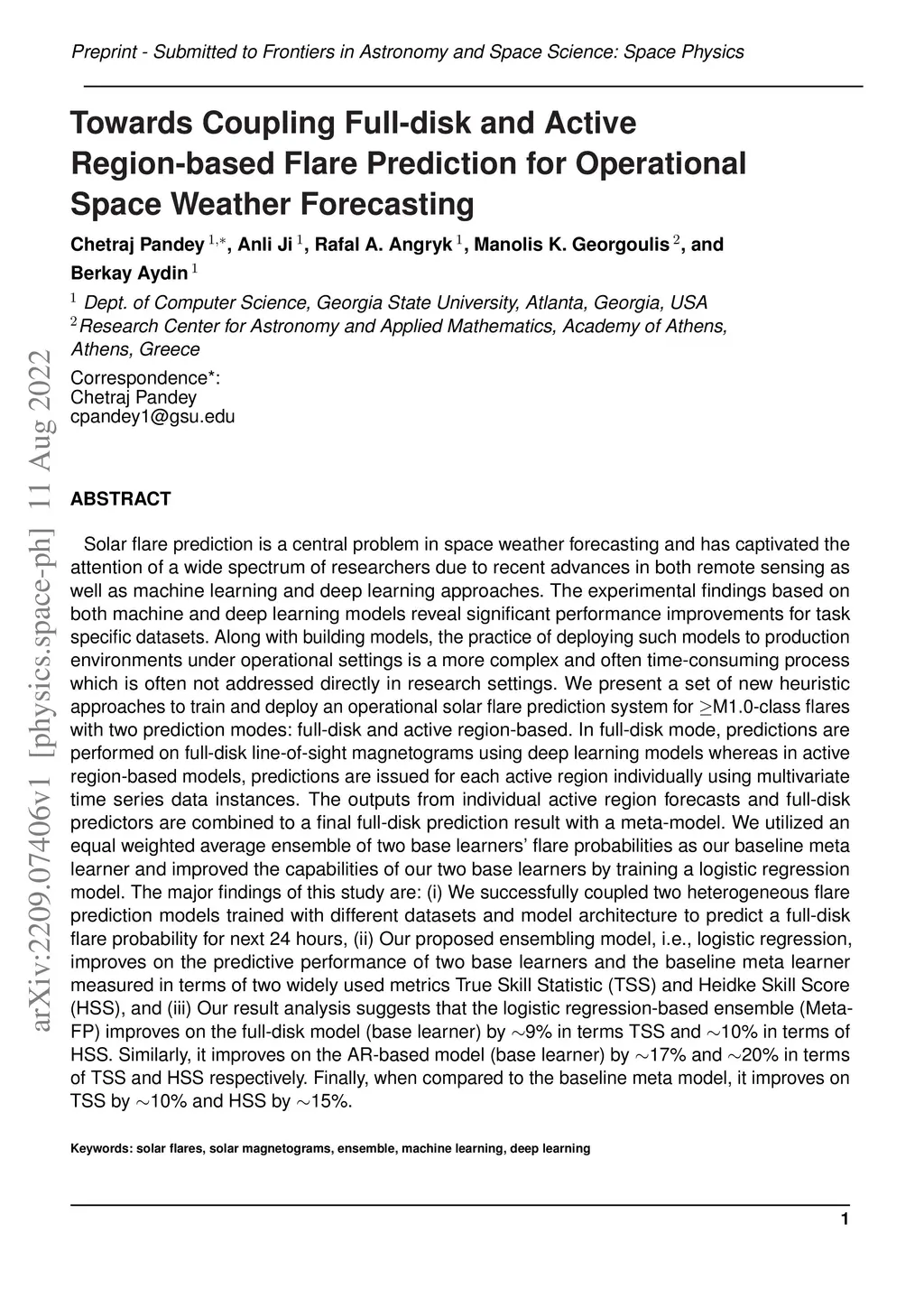 Solar flare prediction is a central problem in space weather forecasting and has captivated the attention of a wide spectrum of researchers due to recent advances in both remote sensing as well as machine learning and deep learning approaches. The experimental findings based on both machine and deep learning models reveal significant performance improvements for task specific datasets. Along with building models, the practice of deploying such models to production environments under operational settings is a more complex and often time-consuming process which is often not addressed directly in research settings. We present a set of new heuristic approaches to train and deploy an operational solar flare prediction system for M1.0-class flares with two prediction modes: full-disk and active region-based. In full-disk mode, predictions are performed on full-disk line-of-sight magnetograms using deep learning models whereas in active region-based models, predictions are issued for each active region individually using multivariate time series data instances. The outputs from individual active region forecasts and full-disk predictors are combined to a final full-disk prediction result with a meta-model. We utilized an equal weighted average ensemble of two base learners' flare probabilities as our baseline meta learner and improved the capabilities of our two base learners by training a logistic regression model. The major findings of this study are: (i) We successfully coupled two heterogeneous flare prediction models trained with different datasets and model architecture to predict a full-disk flare probability for next 24 hours, (ii) Our proposed ensembling model, i.e., logistic regression, improves on the predictive performance of two base learners and the baseline meta learner measured in terms of two widely used metrics True Skill Statistic (TSS) and Heidke Skill core (HSS), and (iii) Our result analysis suggests that the logistic regression-based ensemble (Meta-FP) improves on the full-disk model (base learner) by in terms TSS and in terms of HSS. Similarly, it improves on the AR-based model (base learner) by and in terms of TSS and HSS respectively. Finally, when compared to the baseline meta model, it improves on TSS by and HSS by .