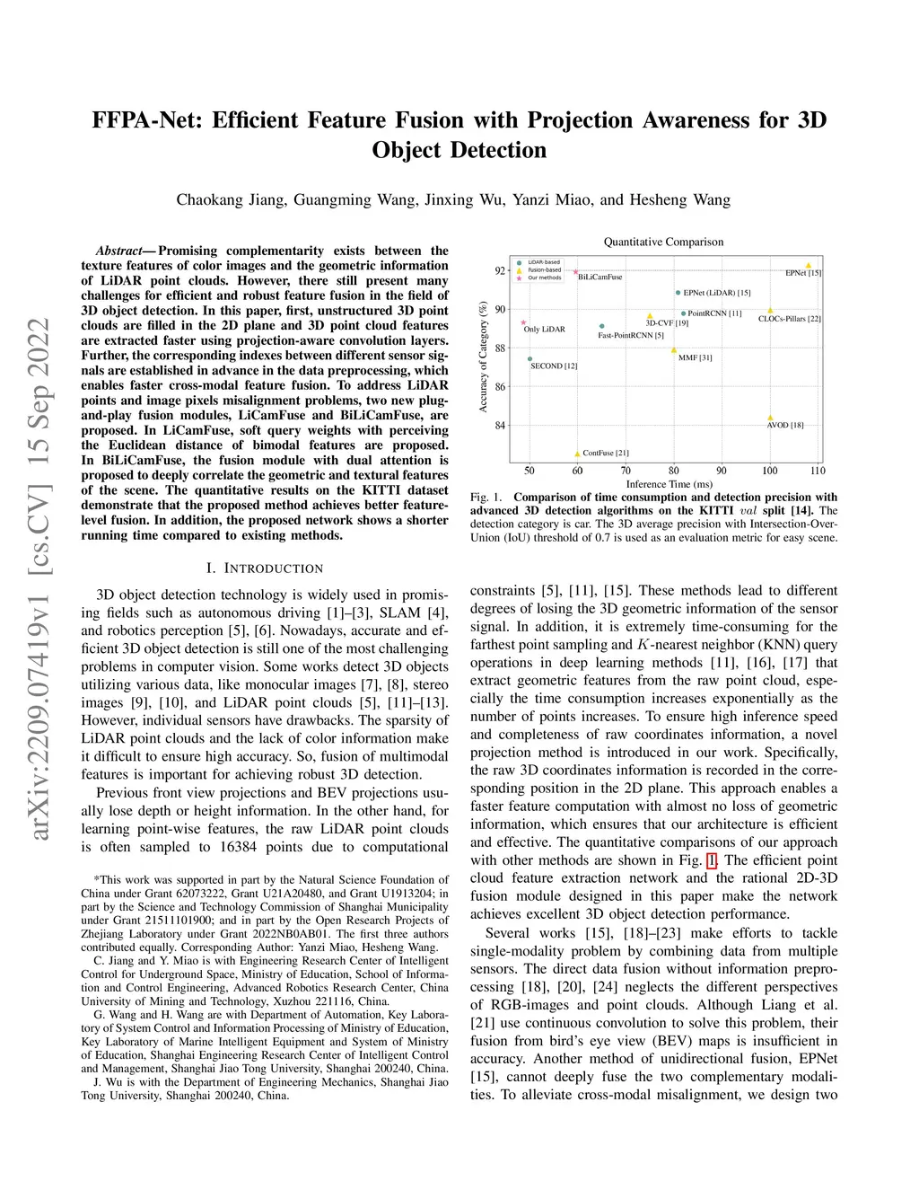 Promising complementarity exists between the texture features of color images and the geometric information of LiDAR point clouds. However, there still present many challenges for efficient and robust feature fusion in the field of 3D object detection. In this paper, first, unstructured 3D point clouds are filled in the 2D plane and 3D point cloud features are extracted faster using projection-aware convolution layers. Further, the corresponding indexes between different sensor signals are established in advance in the data preprocessing, which enables faster cross-modal feature fusion. To address LiDAR points and image pixels misalignment problems, two new plug-and-play fusion modules, LiCamFuse and BiLiCamFuse, are proposed. In LiCamFuse, soft query weights with perceiving the Euclidean distance of bimodal features are proposed. In BiLiCamFuse, the fusion module with dual attention is proposed to deeply correlate the geometric and textural features of the scene. The quantitative results on the KITTI dataset demonstrate that the proposed method achieves better feature-level fusion. In addition, the proposed network shows a shorter running time compared to existing methods.
