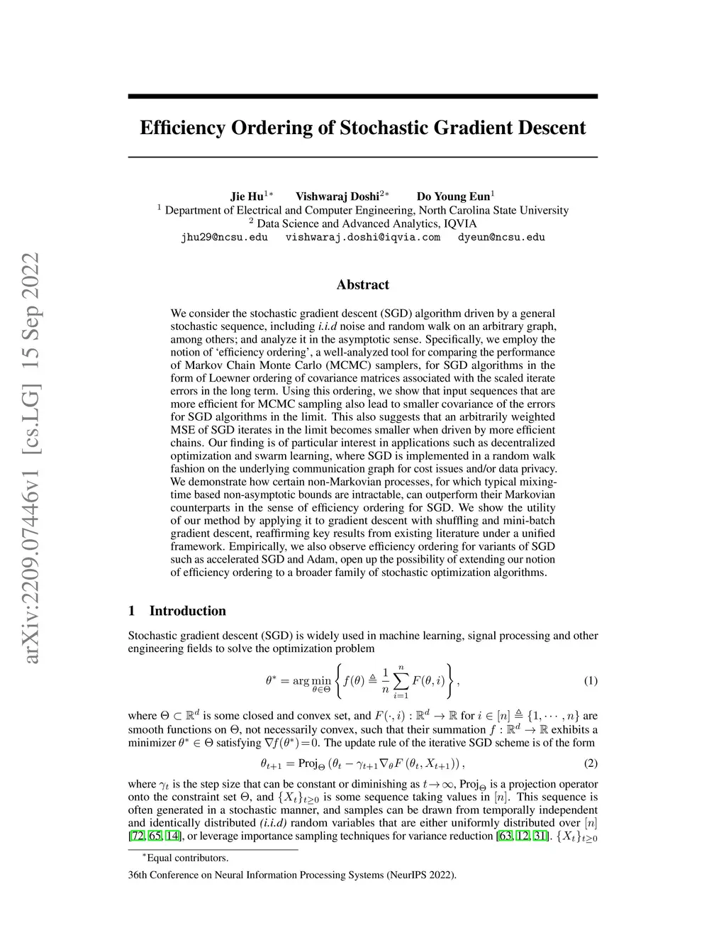 We consider the stochastic gradient descent (SGD) algorithm driven by a general stochastic sequence, including i.i.d noise and random walk on an arbitrary graph, among others; and analyze it in the asymptotic sense. Specifically, we employ the notion of `efficiency ordering', a well-analyzed tool for comparing the performance of Markov Chain Monte Carlo (MCMC) samplers, for SGD algorithms in the form of Loewner ordering of covariance matrices associated with the scaled iterate errors in the long term. Using this ordering, we show that input sequences that are more efficient for MCMC sampling also lead to smaller covariance of the errors for SGD algorithms in the limit. This also suggests that an arbitrarily weighted MSE of SGD iterates in the limit becomes smaller when driven by more efficient chains. Our finding is of particular interest in applications such as decentralized optimization and swarm learning, where SGD is implemented in a random walk fashion on the underlying communication graph for cost issues and/or data privacy. We demonstrate how certain non-Markovian processes, for which typical mixing-time based non-asymptotic bounds are intractable, can outperform their Markovian counterparts in the sense of efficiency ordering for SGD. We show the utility of our method by applying it to gradient descent with shuffling and mini-batch gradient descent, reaffirming key results from existing literature under a unified framework. Empirically, we also observe efficiency ordering for variants of SGD such as accelerated SGD and Adam, open up the possibility of extending our notion of efficiency ordering to a broader family of stochastic optimization algorithms.