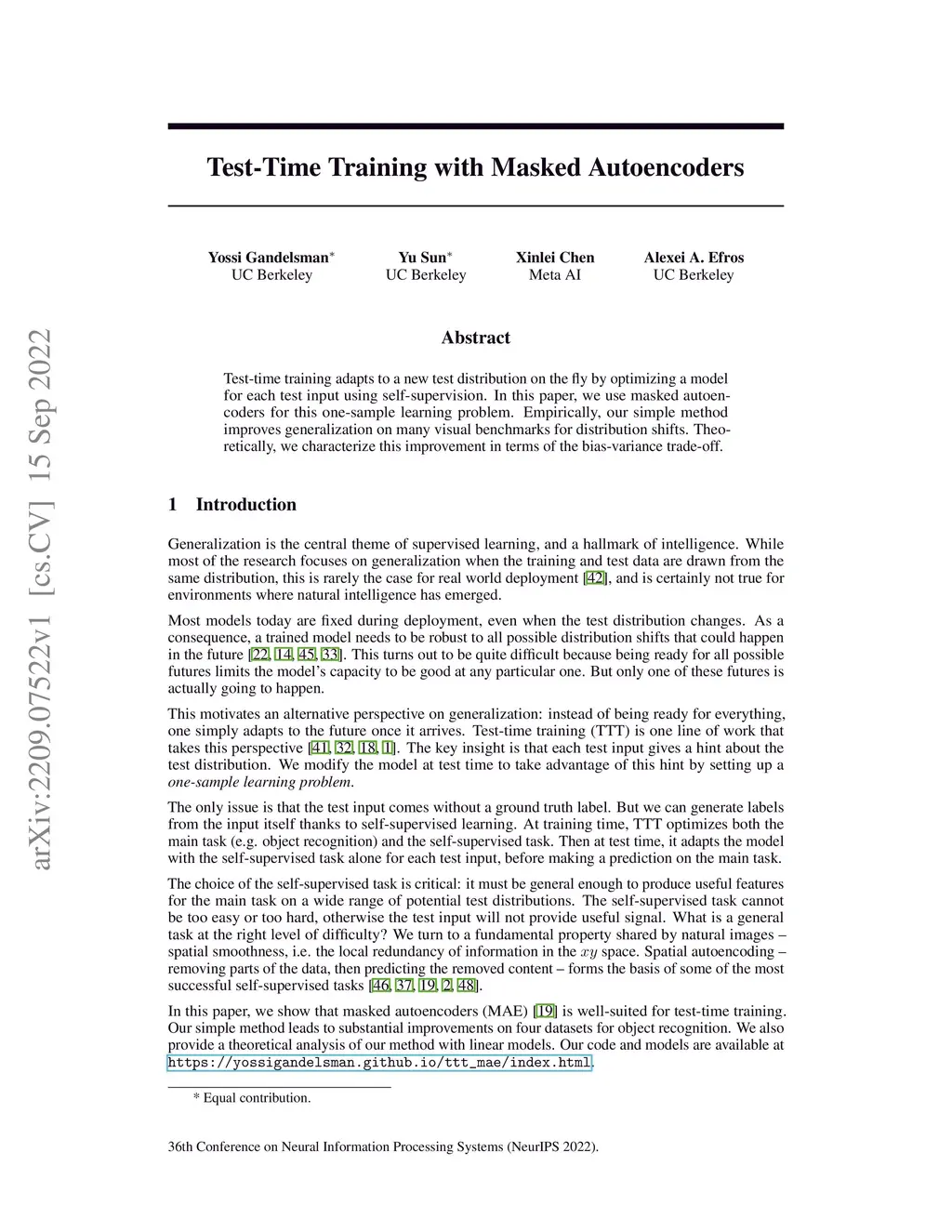 Test-time training adapts to a new test distribution on the fly by optimizing a model for each test input using self-supervision. In this paper, we use masked autoencoders for this one-sample learning problem. Empirically, our simple method improves generalization on many visual benchmarks for distribution shifts. Theoretically, we characterize this improvement in terms of the bias-variance trade-off.