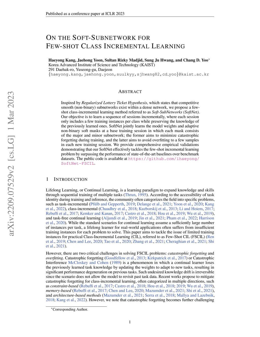 Inspired by Regularized Lottery Ticket Hypothesis (RLTH), which hypothesizes that there exist smooth (non-binary) subnetworks within a dense network that achieve the competitive performance of the dense network, we propose a few-shot class incremental learning (FSCIL) method referred to as \emph{Soft-SubNetworks (SoftNet)}. Our objective is to learn a sequence of sessions incrementally, where each session only includes a few training instances per class while preserving the knowledge of the previously learned ones. SoftNet jointly learns the model weights and adaptive non-binary soft masks at a base training session in which each mask consists of the major and minor subnetwork; the former aims to minimize catastrophic forgetting during training, and the latter aims to avoid overfitting to a few samples in each new training session. We provide comprehensive empirical validations demonstrating that our SoftNet effectively tackles the few-shot incremental learning problem by surpassing the performance of state-of-the-art baselines over benchmark datasets.