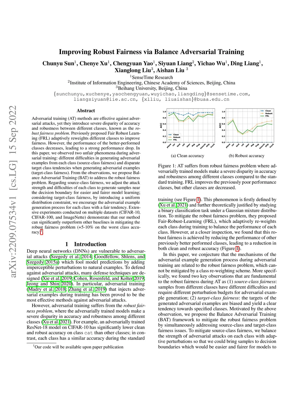 Adversarial training (AT) methods are effective against adversarial attacks, yet they introduce severe disparity of accuracy and robustness between different classes, known as the robust fairness problem. Previously proposed Fair Robust Learning (FRL) adaptively reweights different classes to improve fairness. However, the performance of the better-performed classes decreases, leading to a strong performance drop. In this paper, we observed two unfair phenomena during adversarial training: different difficulties in generating adversarial examples from each class (source-class fairness) and disparate target class tendencies when generating adversarial examples (target-class fairness). From the observations, we propose Balance Adversarial Training (BAT) to address the robust fairness problem. Regarding source-class fairness, we adjust the attack strength and difficulties of each class to generate samples near the decision boundary for easier and fairer model learning; considering target-class fairness, by introducing a uniform distribution constraint, we encourage the adversarial example generation process for each class with a fair tendency. Extensive experiments conducted on multiple datasets (CIFAR-10, CIFAR-100, and ImageNette) demonstrate that our method can significantly outperform other baselines in mitigating the robust fairness problem (+5-10\% on the worst class accuracy)