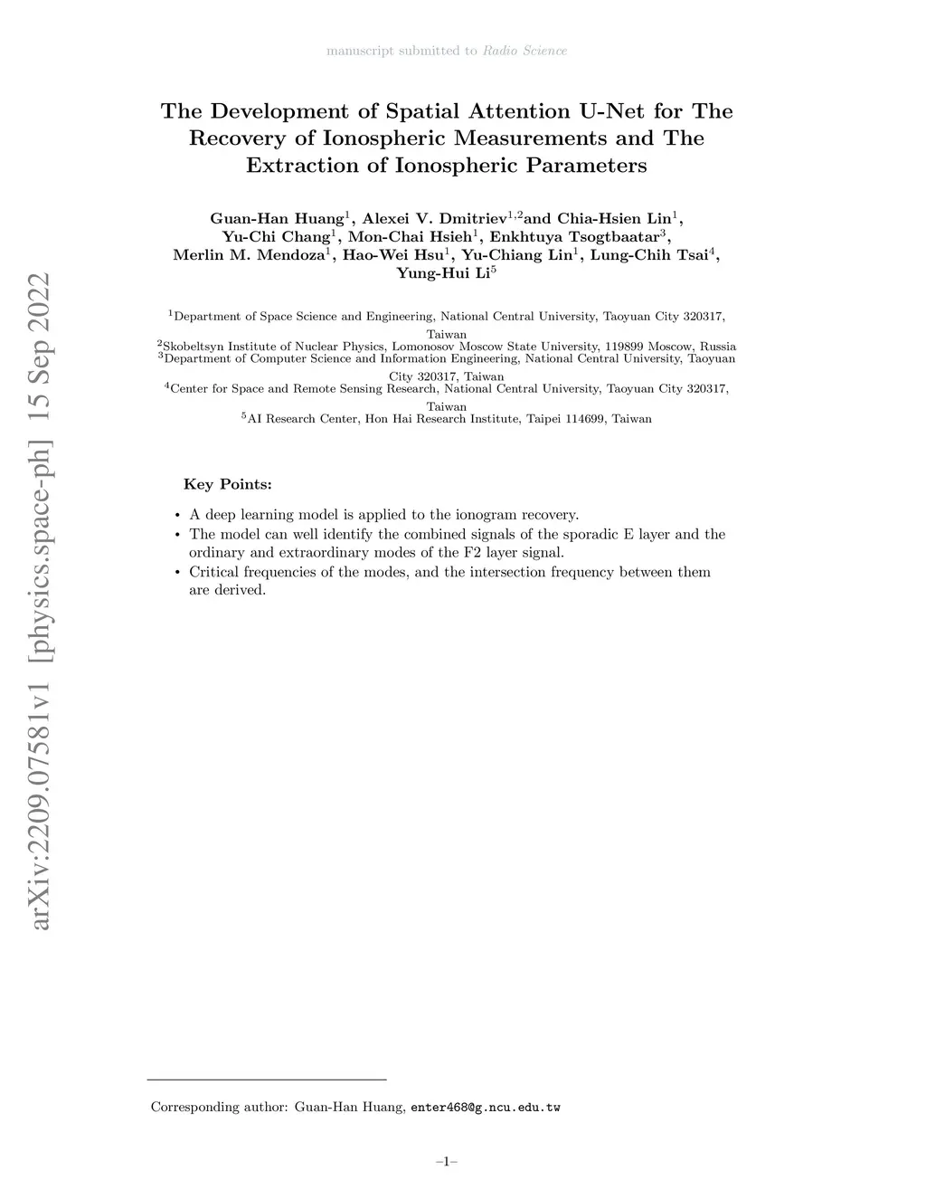 We train a deep learning artificial neural network model, Spatial Attention U-Net to recover useful ionospheric signals from noisy ionogram data measured by Hualien's Vertical Incidence Pulsed Ionospheric Radar. Our results show that the model can well identify F2 layer ordinary and extraordinary modes (F2o, F2x) and the combined signals of the E layer (ordinary and extraordinary modes and sporadic Es). The model is also capable of identifying some signals that were not labeled. The performance of the model can be significantly degraded by insufficient number of samples in the data set. From the recovered signals, we determine the critical frequencies of F2o and F2x and the intersection frequency between the two signals. The difference between the two critical frequencies is peaking at 0.63 MHz, with the uncertainty being 0.18 MHz.