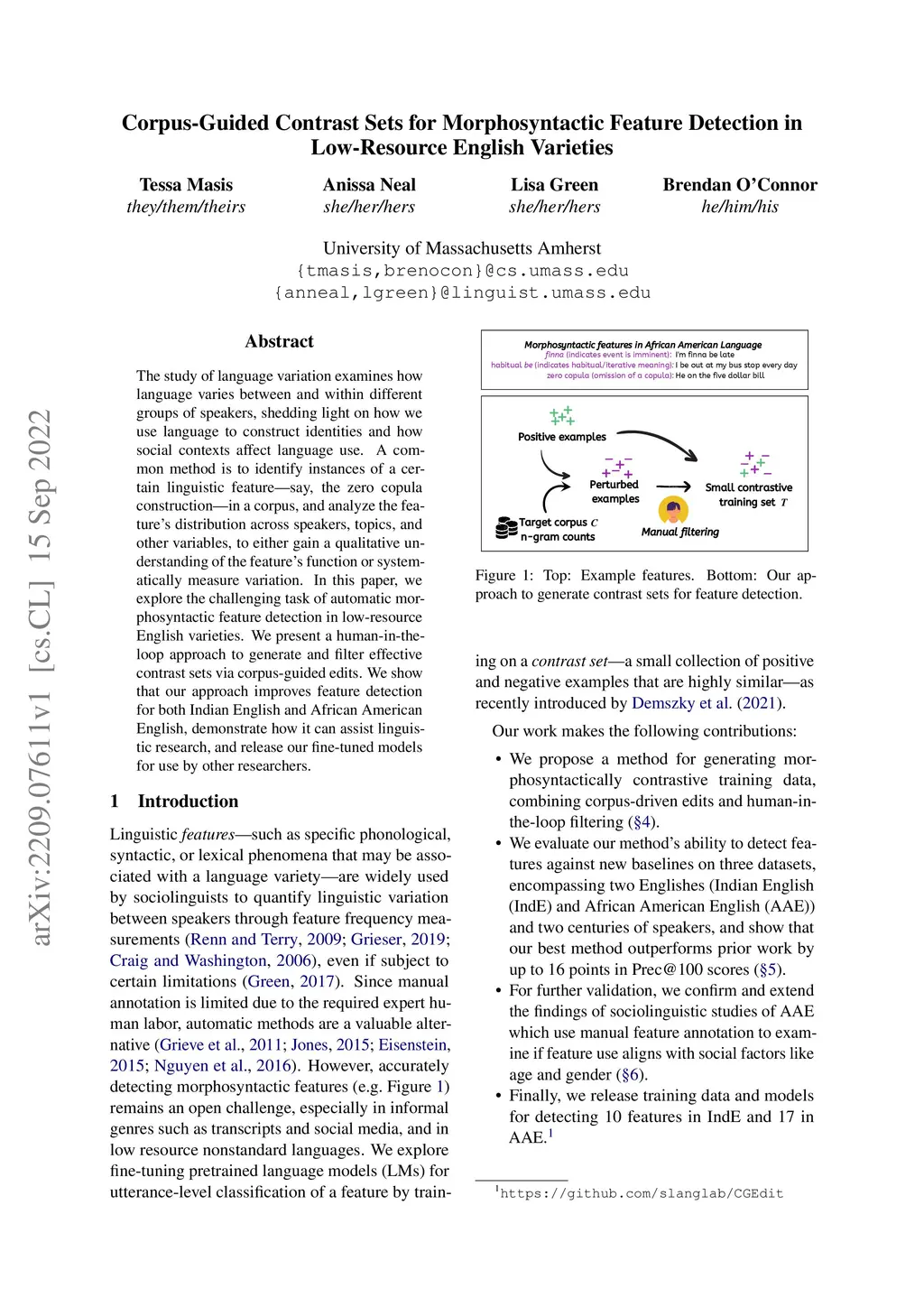 The study of language variation examines how language varies between and within different groups of speakers, shedding light on how we use language to construct identities and how social contexts affect language use. A common method is to identify instances of a certain linguistic feature - say, the zero copula construction - in a corpus, and analyze the feature's distribution across speakers, topics, and other variables, to either gain a qualitative understanding of the feature's function or systematically measure variation. In this paper, we explore the challenging task of automatic morphosyntactic feature detection in low-resource English varieties. We present a human-in-the-loop approach to generate and filter effective contrast sets via corpus-guided edits. We show that our approach improves feature detection for both Indian English and African American English, demonstrate how it can assist linguistic research, and release our fine-tuned models for use by other researchers.
