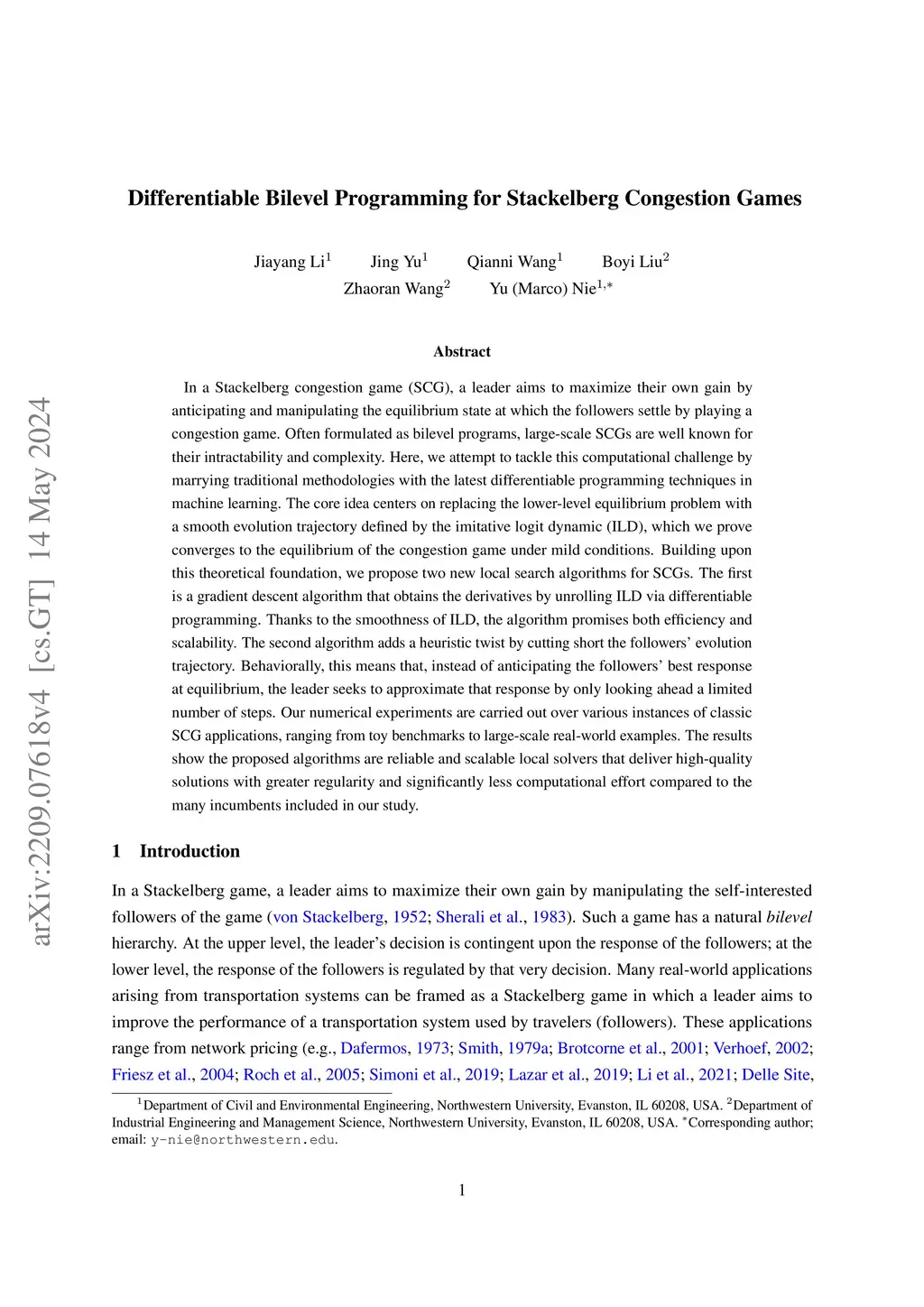 In a Stackelberg congestion game (SCG), a leader aims to maximize their own gain by anticipating and manipulating the equilibrium state at which the followers settle by playing a congestion game. Often formulated as bilevel programs, large-scale SCGs are well known for their intractability and complexity. Here, we attempt to tackle this computational challenge by marrying traditional methodologies with the latest differentiable programming techniques in machine learning. The core idea centers on replacing the lower-level equilibrium problem with a smooth evolution trajectory defined by the imitative logit dynamic (ILD), which we prove converges to the equilibrium of the congestion game under mild conditions. Building upon this theoretical foundation, we propose two new local search algorithms for SCGs. The first is a gradient descent algorithm that obtains the derivatives by unrolling ILD via differentiable programming. Thanks to the smoothness of ILD, the algorithm promises both efficiency and scalability. The second algorithm adds a heuristic twist by cutting short the followers' evolution trajectory. Behaviorally, this means that, instead of anticipating the followers' best response at equilibrium, the leader seeks to approximate that response by only looking ahead a limited number of steps. Our numerical experiments are carried out over various instances of classic SCG applications, ranging from toy benchmarks to large-scale real-world examples. The results show the proposed algorithms are reliable and scalable local solvers that deliver high-quality solutions with greater regularity and significantly less computational effort compared to the many incumbents included in our study.