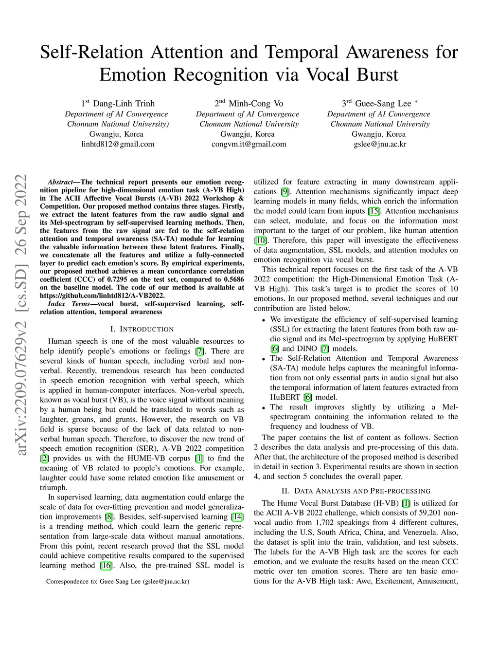 The technical report presents our emotion recognition pipeline for high-dimensional emotion task (A-VB High) in The ACII Affective Vocal Bursts (A-VB) 2022 Workshop \& Competition. Our proposed method contains three stages. Firstly, we extract the latent features from the raw audio signal and its Mel-spectrogram by self-supervised learning methods. Then, the features from the raw signal are fed to the self-relation attention and temporal awareness (SA-TA) module for learning the valuable information between these latent features. Finally, we concatenate all the features and utilize a fully-connected layer to predict each emotion's score. By empirical experiments, our proposed method achieves a mean concordance correlation coefficient (CCC) of 0.7295 on the test set, compared to 0.5686 on the baseline model. The code of our method is available at https://github.com/linhtd812/A-VB2022.