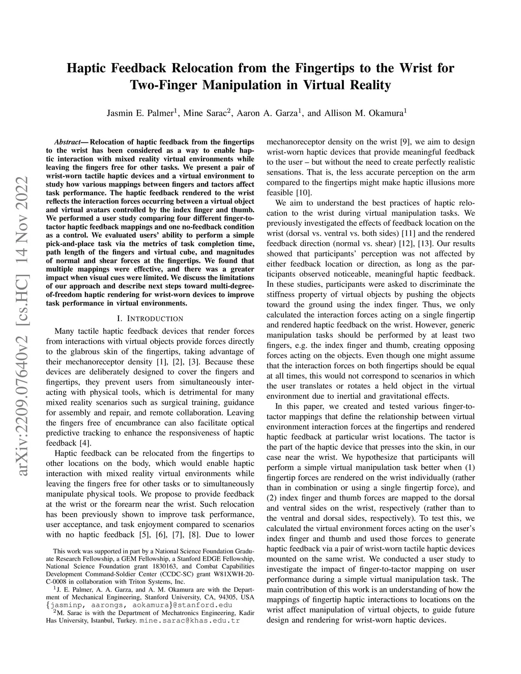 Haptic Feedback Relocation from the Fingertips to the Wrist for