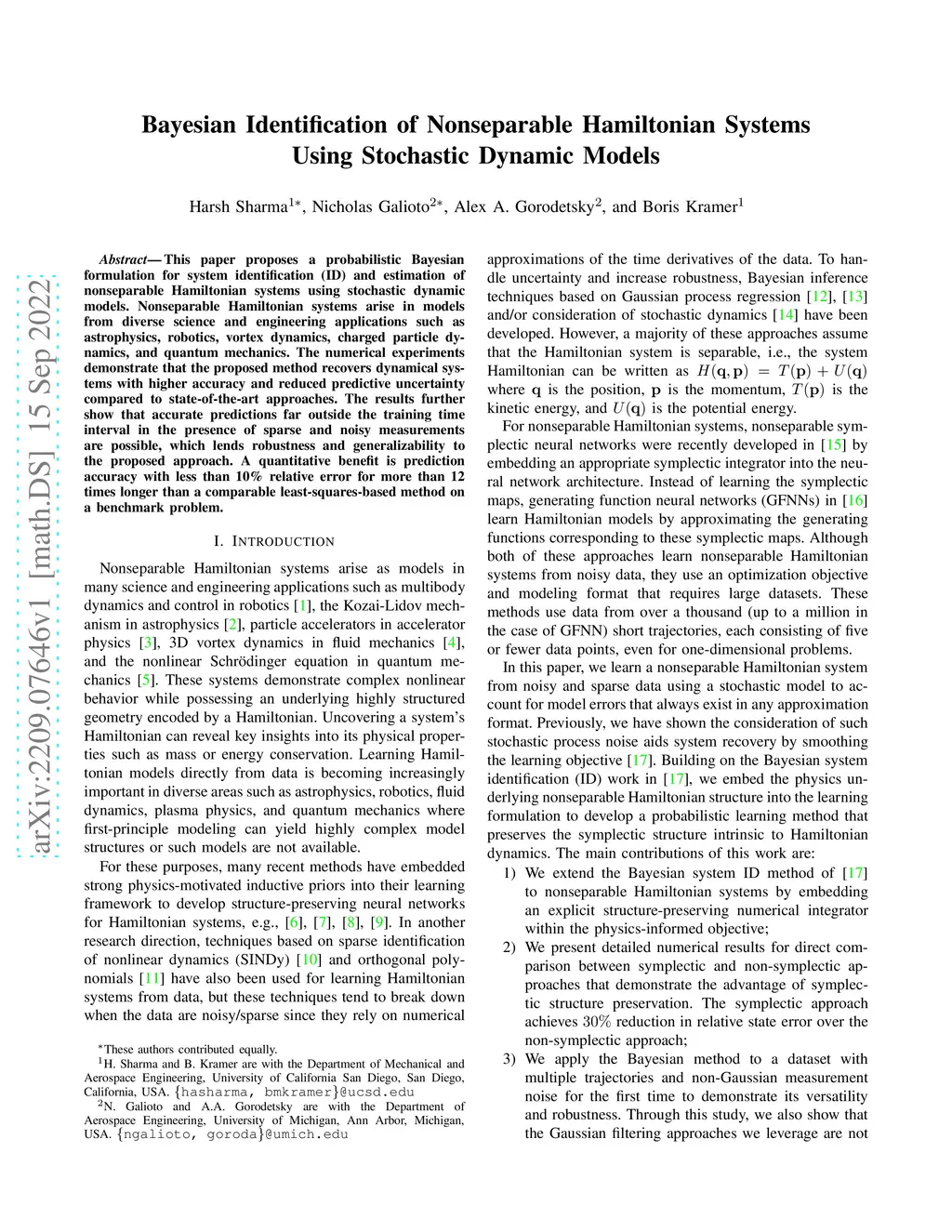This paper proposes a probabilistic Bayesian formulation for system identification (ID) and estimation of nonseparable Hamiltonian systems using stochastic dynamic models. Nonseparable Hamiltonian systems arise in models from diverse science and engineering applications such as astrophysics, robotics, vortex dynamics, charged particle dynamics, and quantum mechanics. The numerical experiments demonstrate that the proposed method recovers dynamical systems with higher accuracy and reduced predictive uncertainty compared to state-of-the-art approaches. The results further show that accurate predictions far outside the training time interval in the presence of sparse and noisy measurements are possible, which lends robustness and generalizability to the proposed approach. A quantitative benefit is prediction accuracy with less than 10% relative error for more than 12 times longer than a comparable least-squares-based method on a benchmark problem.