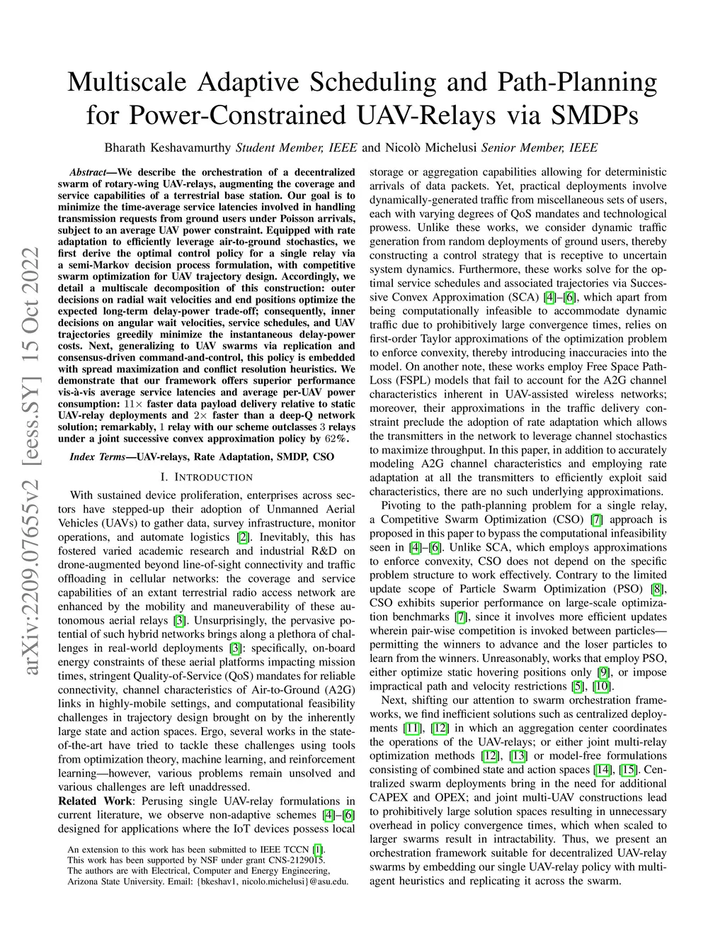 We describe the orchestration of a decentralized swarm of rotary-wing UAV-relays, augmenting the coverage and service capabilities of a terrestrial base station. Our goal is to minimize the time-average service latencies involved in handling transmission requests from ground users under Poisson arrivals, subject to an average UAV power constraint. Equipped with rate adaptation to efficiently leverage air-to-ground channel stochastics, we first derive the optimal control policy for a single relay via a semi-Markov decision process formulation, with competitive swarm optimization for UAV trajectory design. Accordingly, we detail a multiscale decomposition of this construction: outer decisions on radial wait velocities and end positions optimize the expected long-term delay-power trade-off; consequently, inner decisions on angular wait velocities, service schedules, and UAV trajectories greedily minimize the instantaneous delay-power costs. Next, generalizing to UAV swarms via replication and consensus-driven command-and-control, this policy is embedded with spread maximization and conflict resolution heuristics. We demonstrate that our framework offers superior performance with respect to average service latencies and average per-UAV power consumption: 11x faster data payload delivery relative to static UAV-relay deployments and 2x faster than a deep-Q network solution; remarkably, one relay with our scheme outclasses three relays under a joint successive convex approximation policy by 62%.
