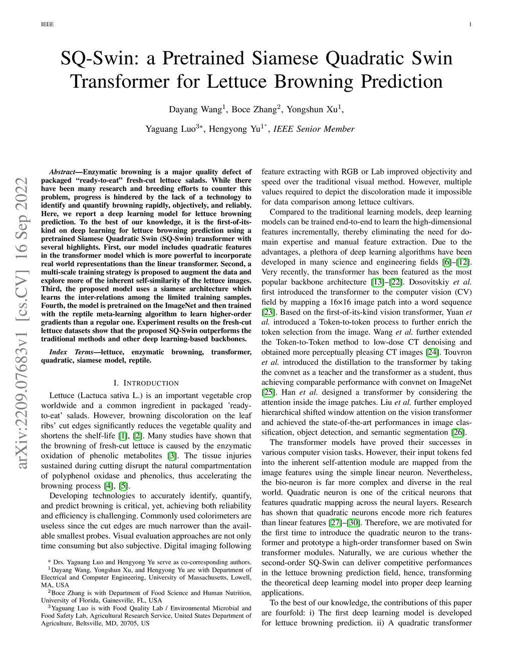 SQ-Swin: a Pretrained Siamese Quadratic Swin Transformer for Lettuce
