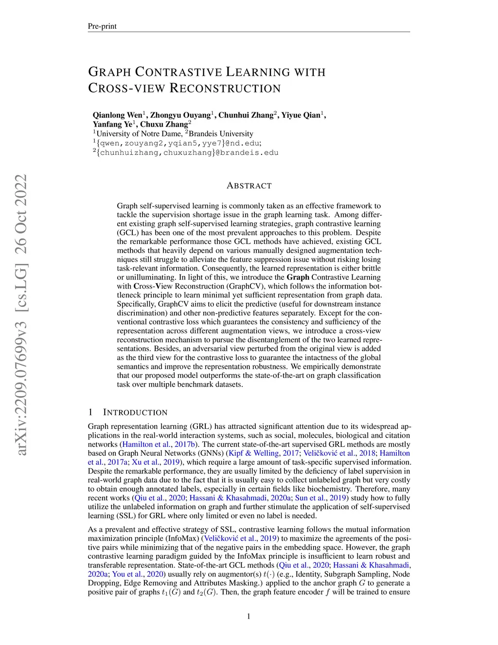 Among different existing graph self-supervised learning strategies, graph contrastive learning (GCL) has been one of the most prevalent approaches to this problem. Despite the remarkable performance those GCL methods have achieved, existing GCL methods that heavily depend on various manually designed augmentation techniques still struggle to alleviate the feature suppression issue without risking losing task-relevant information. Consequently, the learned representation is either brittle or unilluminating. In light of this, we introduce the Graph Contrastive Learning with Cross-View Reconstruction (GraphCV), which follows the information bottleneck principle to learn minimal yet sufficient representation from graph data. Specifically, GraphCV aims to elicit the predictive (useful for downstream instance discrimination) and other non-predictive features separately. Except for the conventional contrastive loss which guarantees the consistency and sufficiency of the representation across different augmentation views, we introduce a cross-view reconstruction mechanism to pursue the disentanglement of the two learned representations. Besides, an adversarial view perturbed from the original view is added as the third view for the contrastive loss to guarantee the intactness of the global semantics and improve the representation robustness. We empirically demonstrate that our proposed model outperforms the state-of-the-art on graph classification task over multiple benchmark datasets.