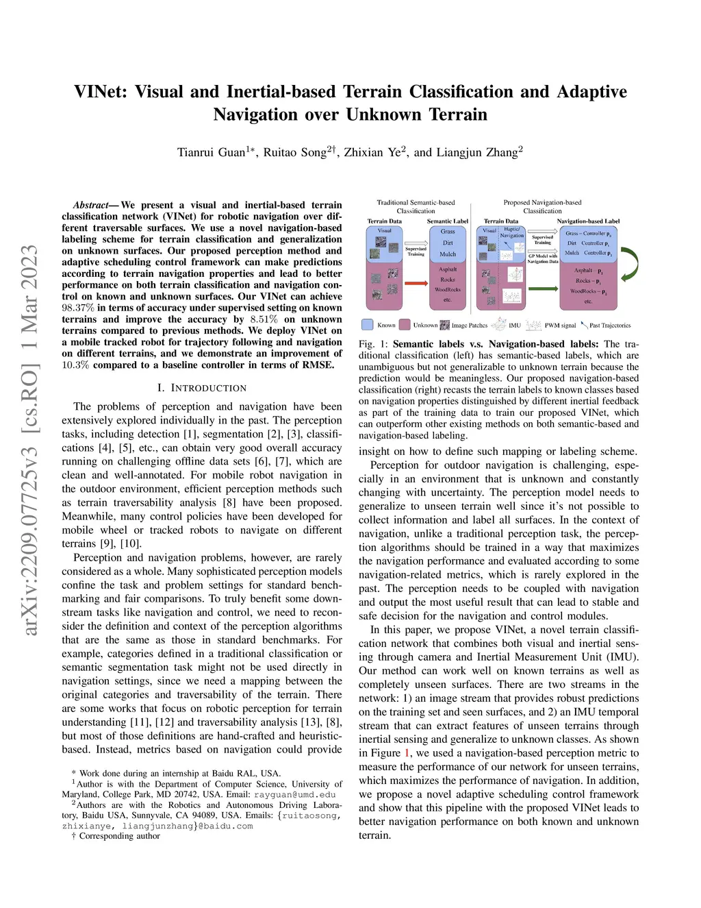 We present a visual and inertial-based terrain classification network (VINet) for robotic navigation over different traversable surfaces. We use a novel navigation-based labeling scheme for terrain classification and generalization on unknown surfaces. Our proposed perception method and adaptive scheduling control framework can make predictions according to terrain navigation properties and lead to better performance on both terrain classification and navigation control on known and unknown surfaces. Our VINet can achieve 98.37% in terms of accuracy under supervised setting on known terrains and improve the accuracy by 8.51% on unknown terrains compared to previous methods. We deploy VINet on a mobile tracked robot for trajectory following and navigation on different terrains, and we demonstrate an improvement of 10.3% compared to a baseline controller in terms of RMSE.