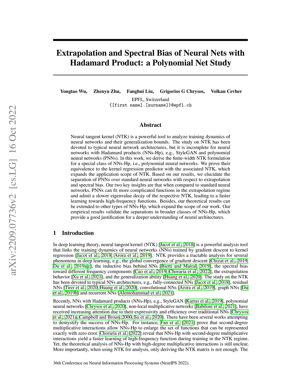 Extrapolation and Spectral Bias of Neural Nets with Hadamard Product: a