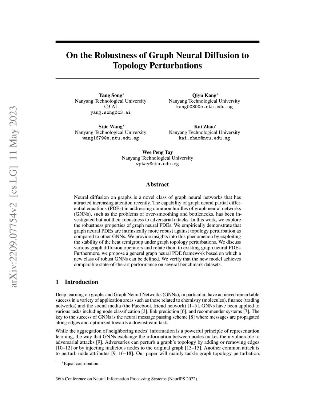 Neural diffusion on graphs is a novel class of graph neural networks that has attracted increasing attention recently. The capability of graph neural partial differential equations (PDEs) in addressing common hurdles of graph neural networks (GNNs), such as the problems of over-smoothing and bottlenecks, has been investigated but not their robustness to adversarial attacks. In this work, we explore the robustness properties of graph neural PDEs. We empirically demonstrate that graph neural PDEs are intrinsically more robust against topology perturbation as compared to other GNNs. We provide insights into this phenomenon by exploiting the stability of the heat semigroup under graph topology perturbations. We discuss various graph diffusion operators and relate them to existing graph neural PDEs. Furthermore, we propose a general graph neural PDE framework based on which a new class of robust GNNs can be defined. We verify that the new model achieves comparable state-of-the-art performance on several benchmark datasets.
