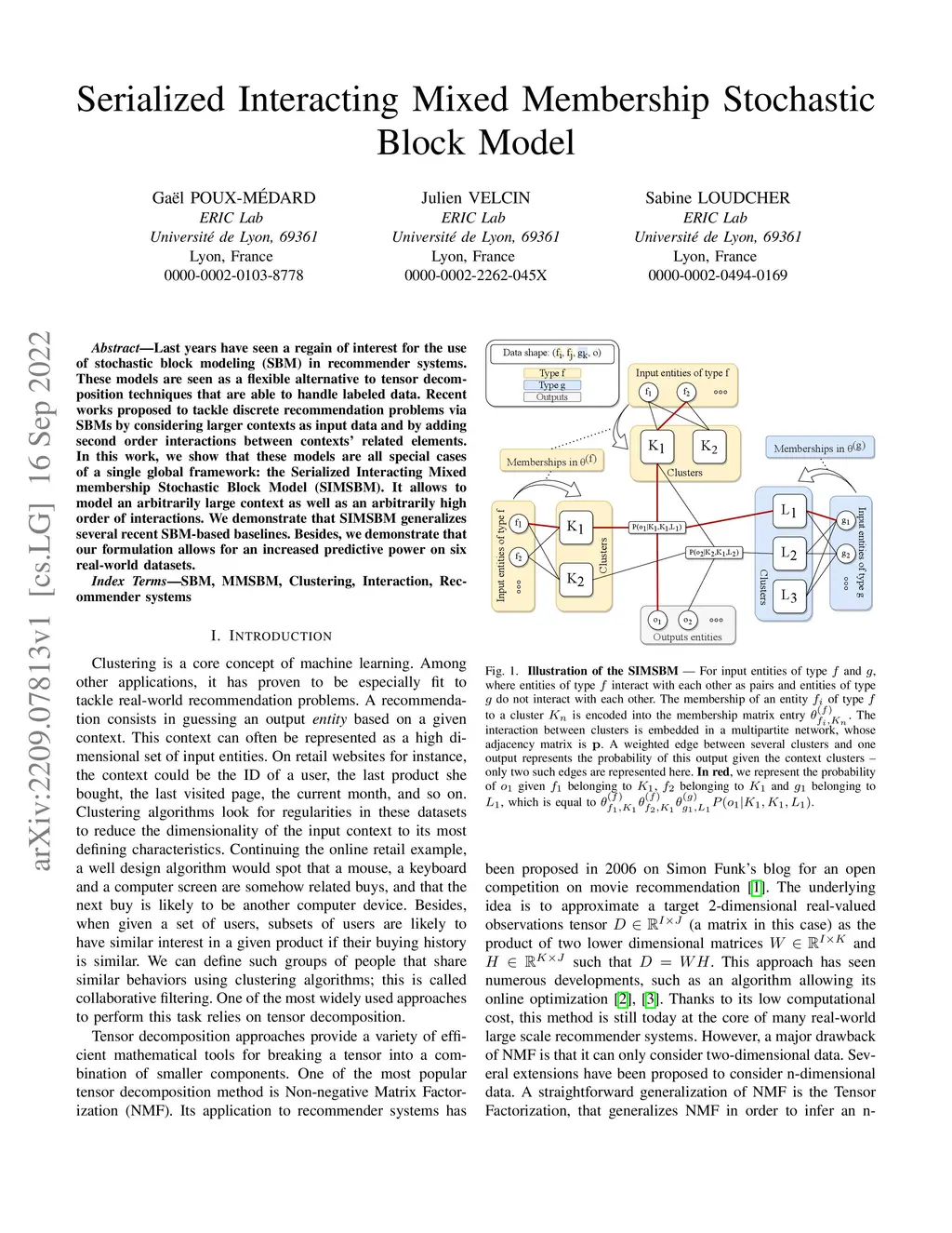 Last years have seen a regain of interest for the use of stochastic block modeling (SBM) in recommender systems. These models are seen as a flexible alternative to tensor decomposition techniques that are able to handle labeled data. Recent works proposed to tackle discrete recommendation problems via SBMs by considering larger contexts as input data and by adding second order interactions between contexts' related elements. In this work, we show that these models are all special cases of a single global framework: the Serialized Interacting Mixed membership Stochastic Block Model (SIMSBM). It allows to model an arbitrarily large context as well as an arbitrarily high order of interactions. We demonstrate that SIMSBM generalizes several recent SBM-based baselines. Besides, we demonstrate that our formulation allows for an increased predictive power on six real-world datasets.